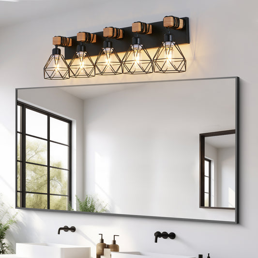 31' Modern Geometric 5-Light Vanity Light Fixture with Black Metal, Wooden Accents and Cage Lampshade for Bathroom, Bedroom, or Living Room (Bulb Not Included)