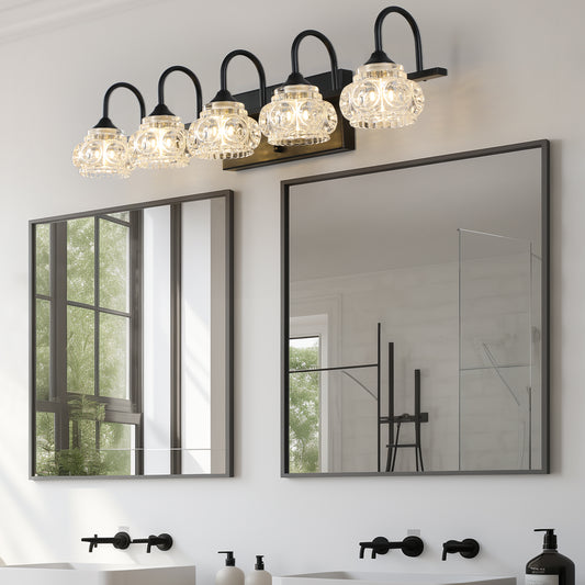 29' Retro 5-Light Bathroom Vanity Light Fixture - Black Finish with Crystal Glass Shades, Wall Mounted Lighting for Bathroom, Powder Room, and Vanity Mirror (No Bulbs)