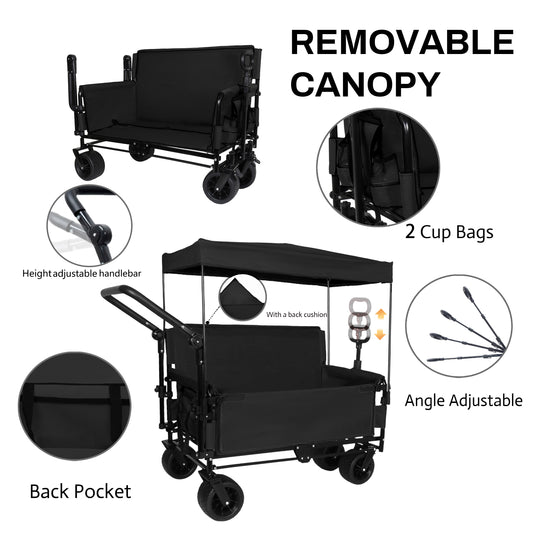 3-in-1 Folding Wagon Cart with Bench Seat & Canopy & Storage, 500lbs Heavy-Duty, 180L Capacity, All-Terrain Wagon for Camping, Beach, Sports, & Garden, Black