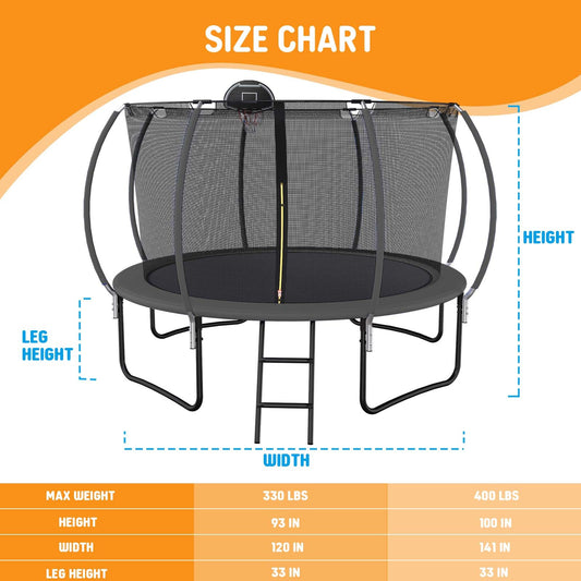 12 FT TRAMPOLINE BLACK PUMPKIN-STYLE SAFETY NET WITH BASKETBALL HOOP