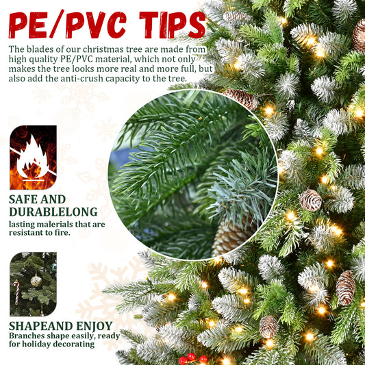 6ft Pre-Lit Artificial Christmas Tree with 380 Warm White LED Lights, 1264 Tips, Frosted Greenery with Red Berries & Natural Pinecones, Full Holiday Tree with Sturdy Metal Stand for Indoor Decoration
