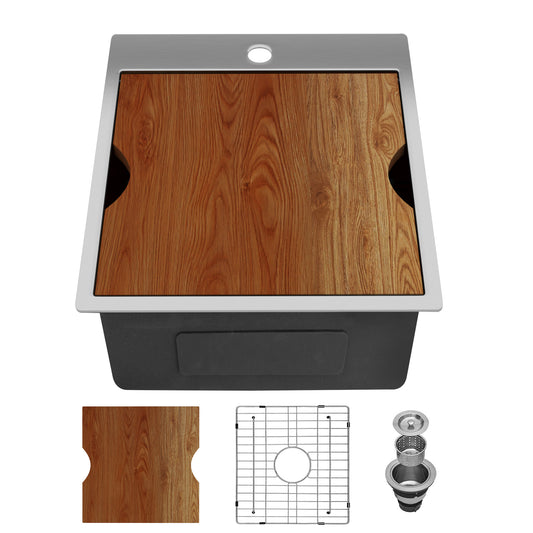 13x15 Inch Drop in Workstation Bar Sink, Handcrafted 18 Gauge Drop in Topmount Stainless Steel Small Wet Bar Sink R10 Corners Outdoor RV Sink Single Bowl with Strainer, Bottom Grid & Cutting Board