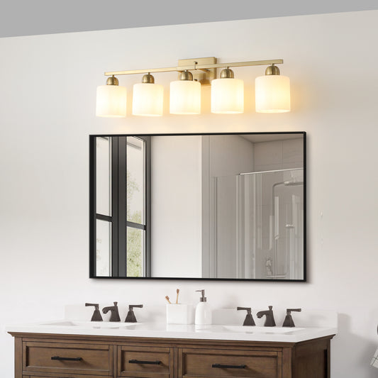 Gold Bathroom Light Fixtures, 5-Light Modern Vanity Light Over Mirror, Wall Sconces with Milky White Frosted Glass Shades, E26 Socket (Bulbs Not Included)
