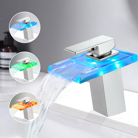 Bathroom Sink Faucet LED Light 3 Colors Changing Waterfall Glass Spout Hot Cold Water Mixer Single Handle One Hole Deck Mounted Bathroom Faucet Black Lavatory Vanity Basin Bath Plumbing Fixtures