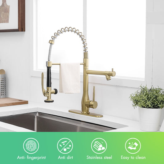 Kitchen Faucet with Pull Down Sprayer Brushed Gold Stainless Steel Single Handle Pull Out Spring Sink Faucets
