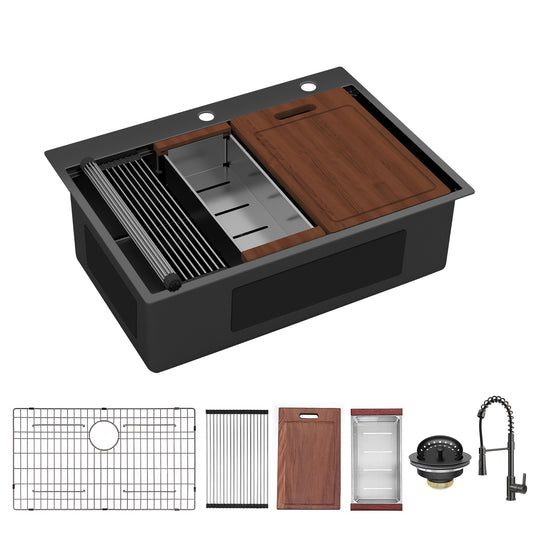 30 Inch Topmount Gunmetal Black Workstation 18 Gauge Stainless Steel Kitchen Sink With Black Spring Neck Faucet