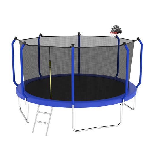 15FT Trampoline with Basketball Hoop Inflator and Ladder, 6pcs extra safety net pole sleeves- Blue