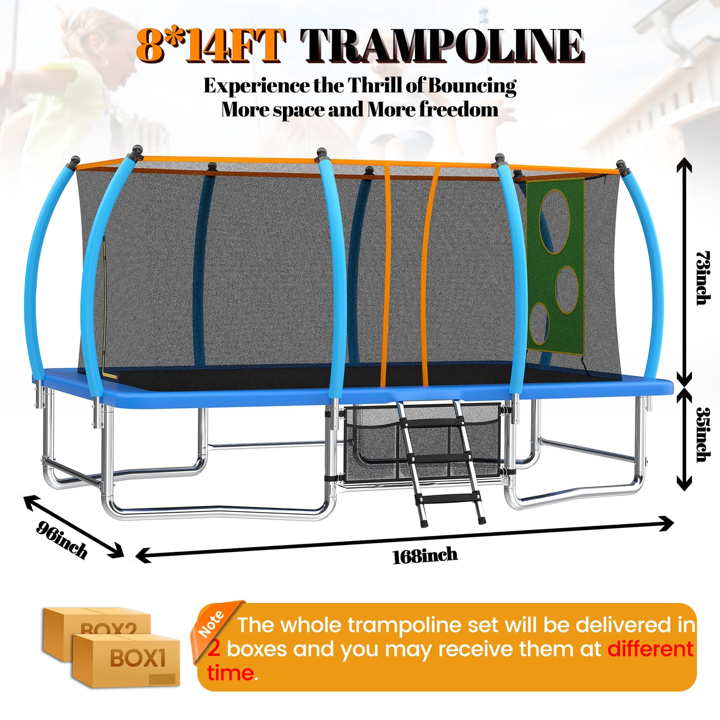 - Safety First-8*14FT Trampoline is equipt with 8 high safety enclosure poles and heavy gauge galvanized rust resistance steel construction. 4 W-shaped legs secure stability.