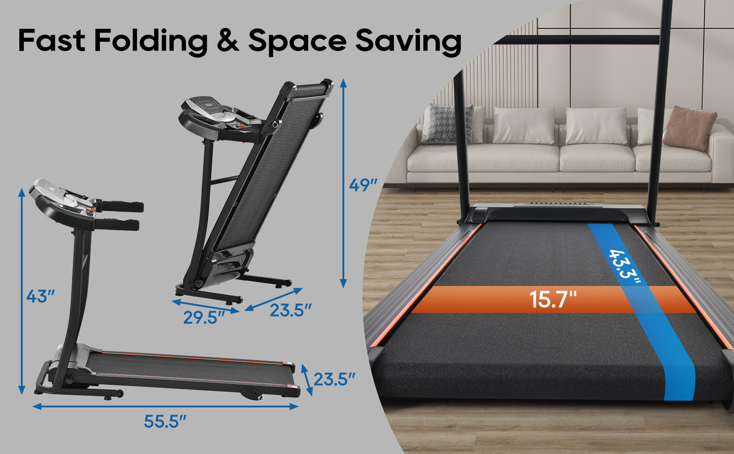 [SUITABLE] - The tread band measures 15.7'' x 41.3'' for extra security and freedom. Can hold 300lbs of user weight. Assembled Dimensions: 55.5'' x 24.2'' x 41.5''. Folded Dimensions: 29.5'' x 24.2'' x 49''.