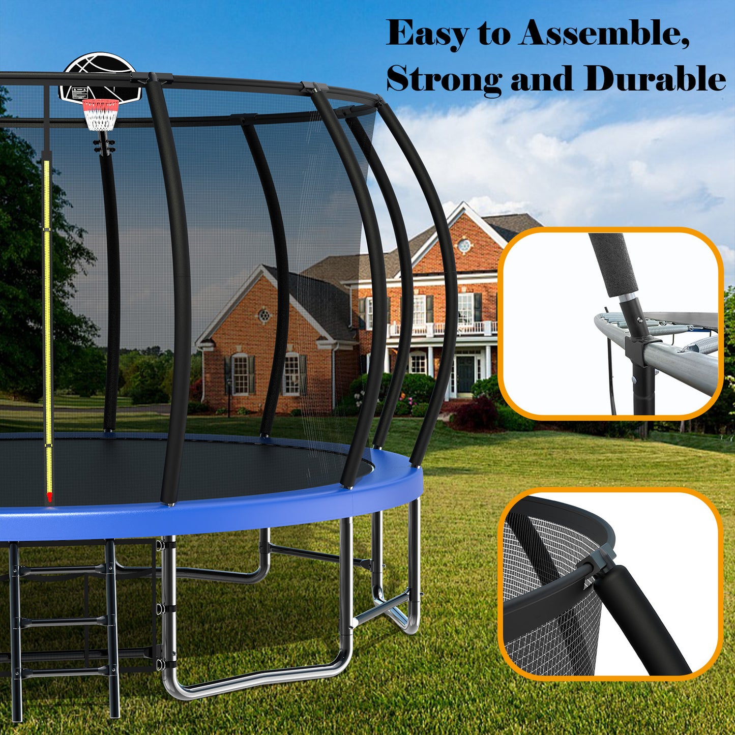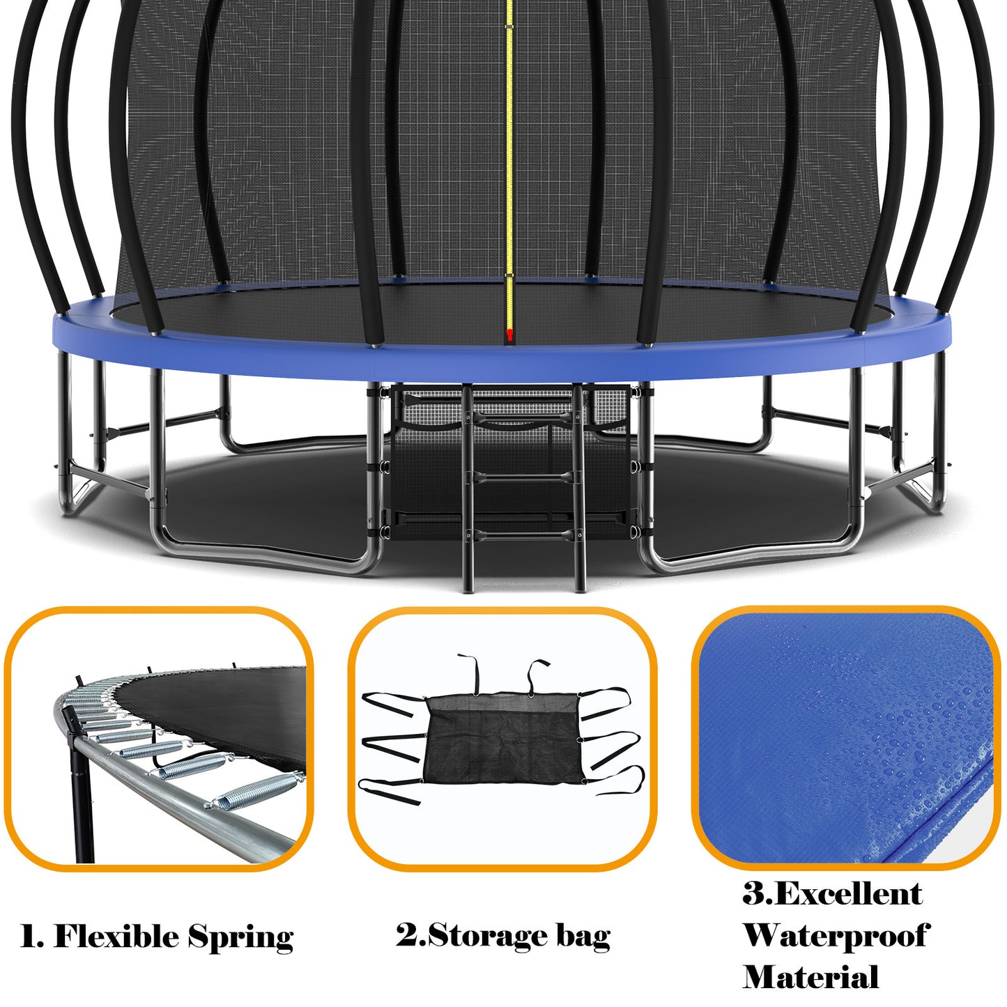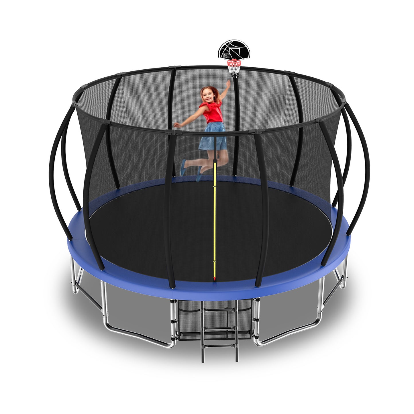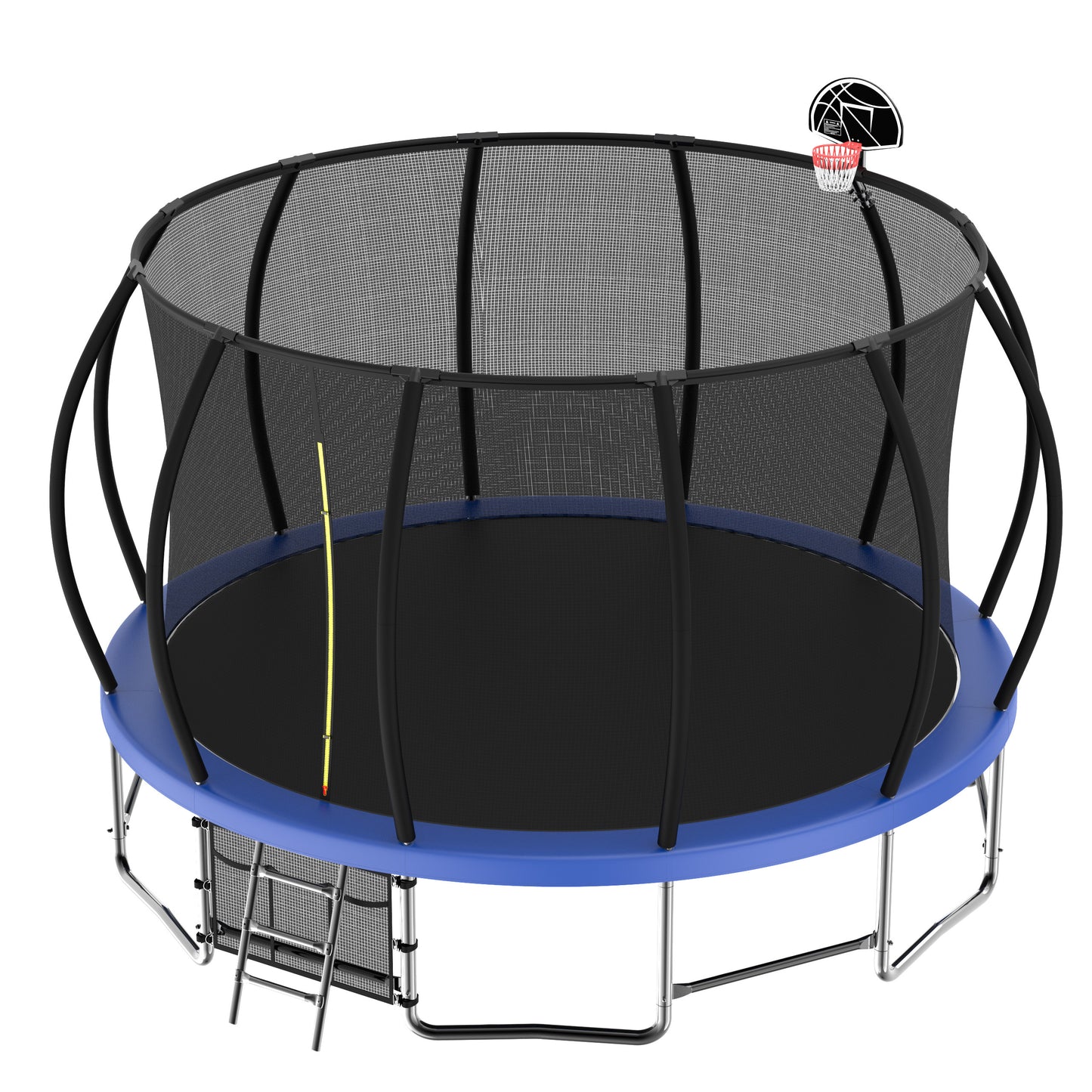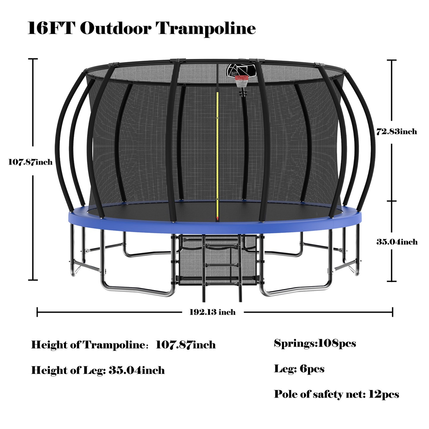 - Safety First-16 FT Trampoline is equipt with 12 high safety enclosure poles and heavy gauge galvanized rust resistance steel construction. 6 W-shaped legs secure stability.