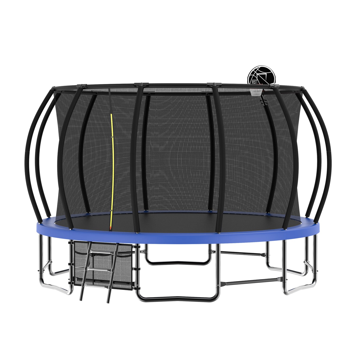 - Solid Structure-12 foam padded poles to support UV-proof safety trampoline enclosure net for maximum safety while jumping. Heavy duty 3-step galvanized steel ladder offers convenient maneuverability in and out of the trampoline.
