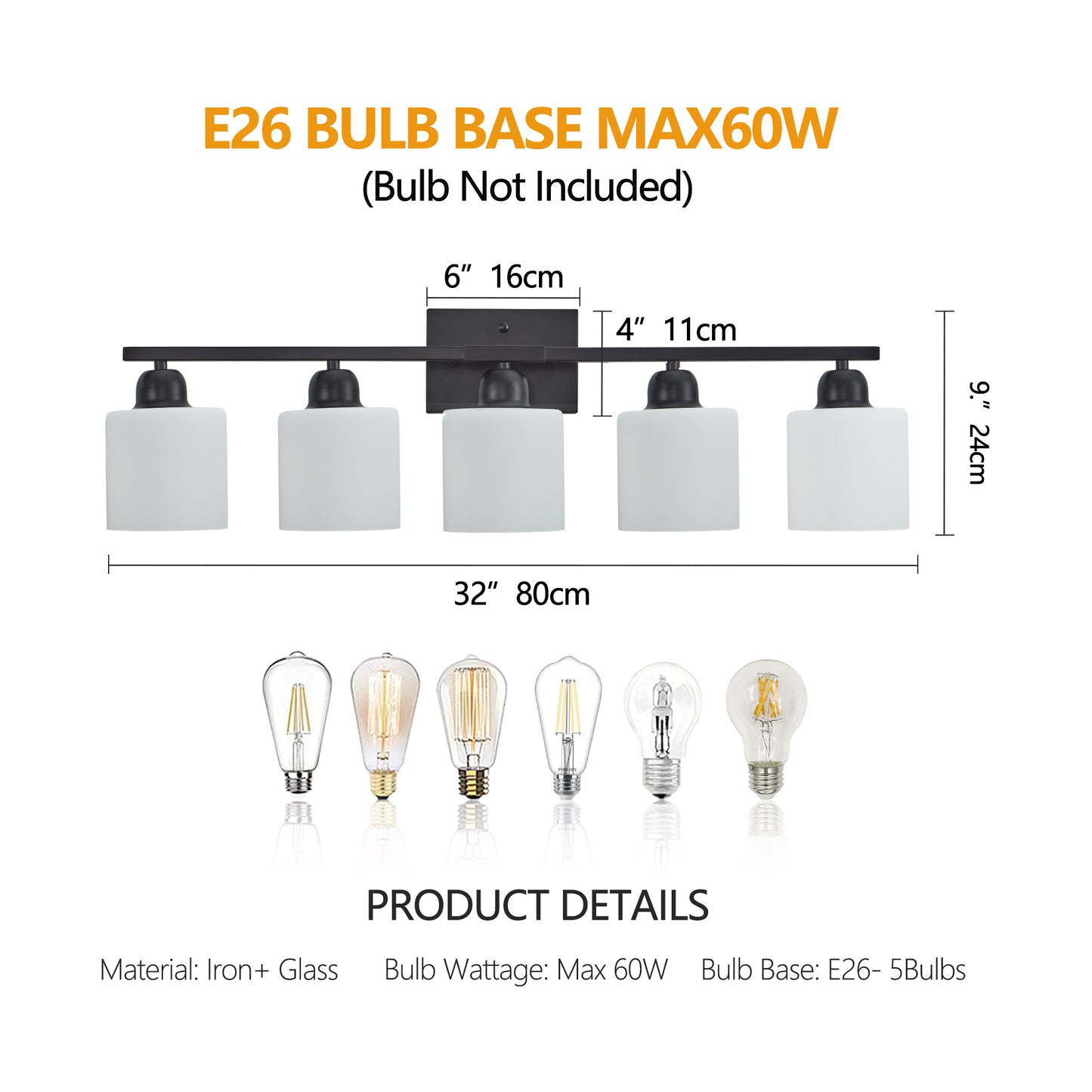 Black Bathroom Light Fixtures, 5-Light Modern Vanity Light Over Mirror, Wall Sconces with Milky White Frosted Glass Shades, E26 Socket (Bulbs Not Included)