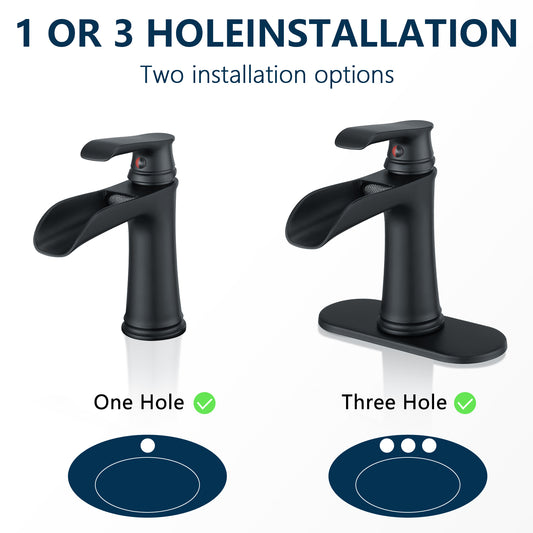 Sink Faucet With Deck Plate Waterfall Black with Pop Up Drain and Supply Lines Bathroom faucets for Sink 1 Hole or 3 Holes One Handle Faucets Vanity Bath Mixer Tap