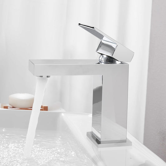 Modern Chrome Bathroom Faucet, Single Hole Bathroom Faucet, Solid Brass Chrome Polished Bathroom Sink Faucet, Single Handle Heavy Duty Square Basin Vanity Square Bathroom Faucet with Pop-up Drain