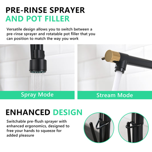 Heavy Duty Commercial Style Kitchen Sink Faucet, Single Handle Pre-Rinse Spring Sprayer Kitchen Faucets, High Arc Pull Down Matte Black Kitchen Faucet