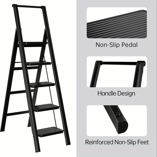 5-step ladder, folding ladder stool, with anti slip wide pedals, steel ladder, with safety anti slip handle, lightweight 330 pound portable steel ladder stool in black