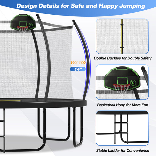 16FT Trampoline with Basketball Hoop for Kids and Adults, Round Outdoor Trampoline with Enclosure Net & Curved Poles & Ladder