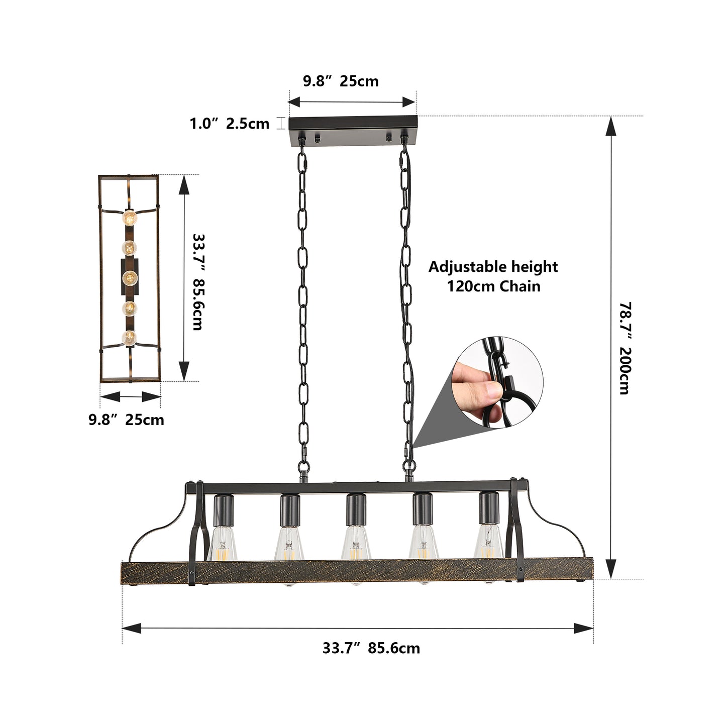 34-Inch Black and Gold Vintage Pendant Light, 5 E26 Bulb Sockets, Adjustable Chain Height