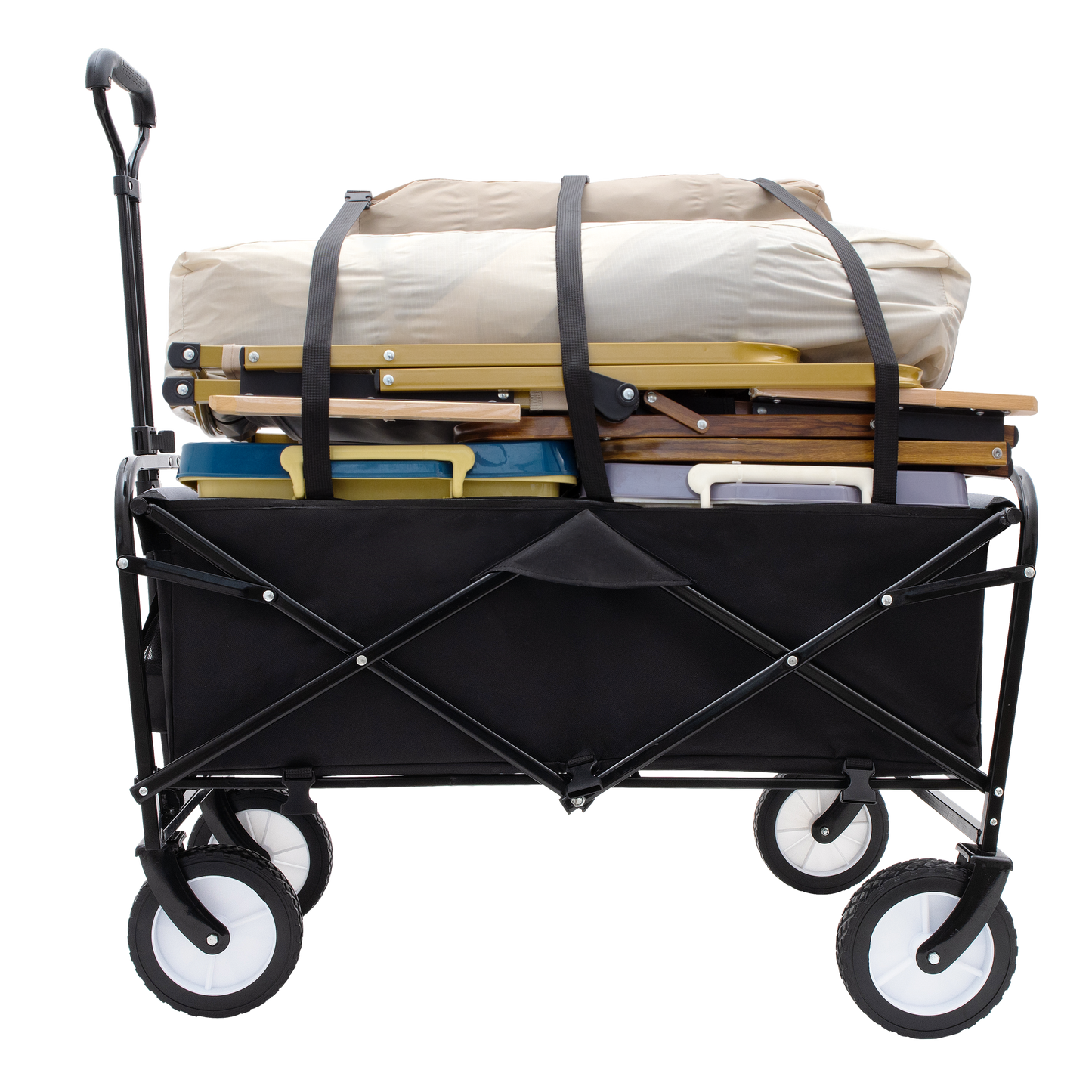 - Unique Strapping System: Our exclusive strapping system allows you to securely tie down taller or longer items, either on top or along the sides of the cart, providing added versatility and stability for your cargo.