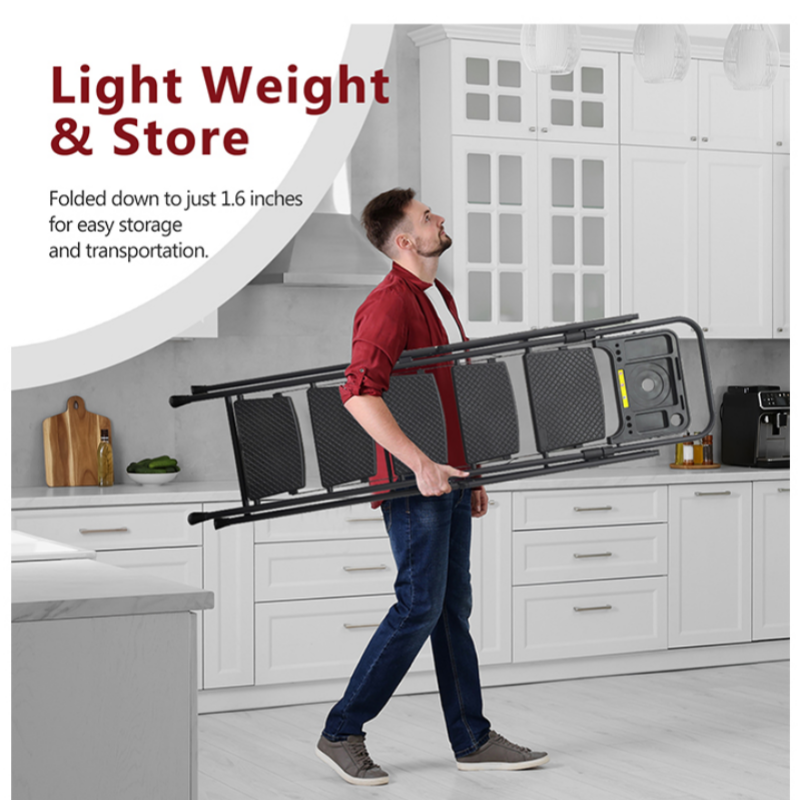 - SECURITY AND STABILITY: High-grade steel frame is constructed with strength and reliability. The back cross brace structure reinforce the basic support which will make you feel more safe climbing up the step ladder.