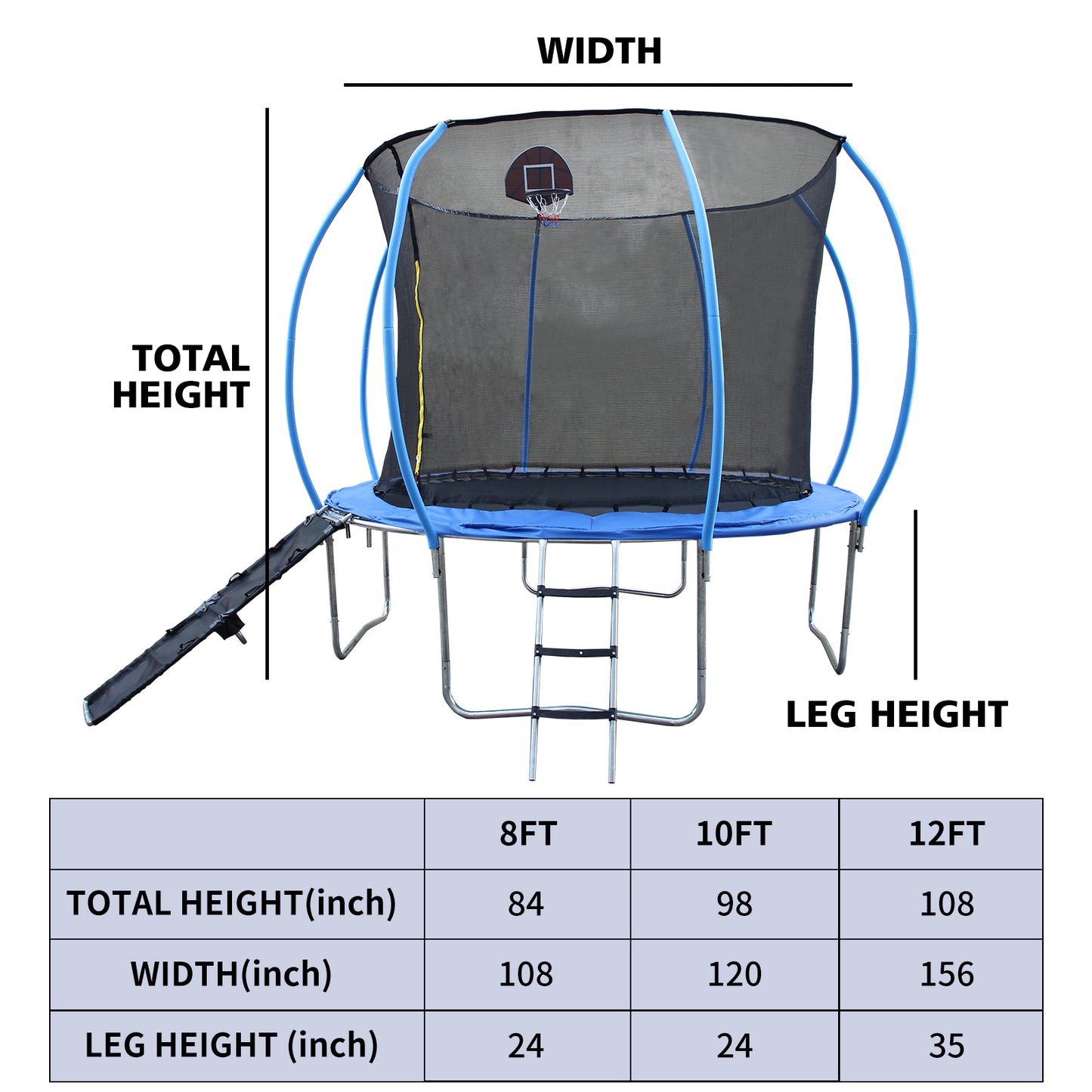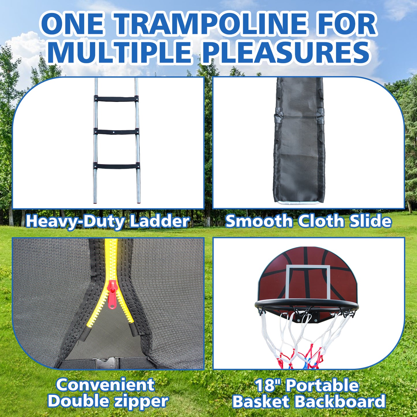 - 【MULTIPLE FUN】 Comes with an 18-inch mini basket board and slide accessory to make the trampoline more than just a bouncing tool, adding more activity for children.
