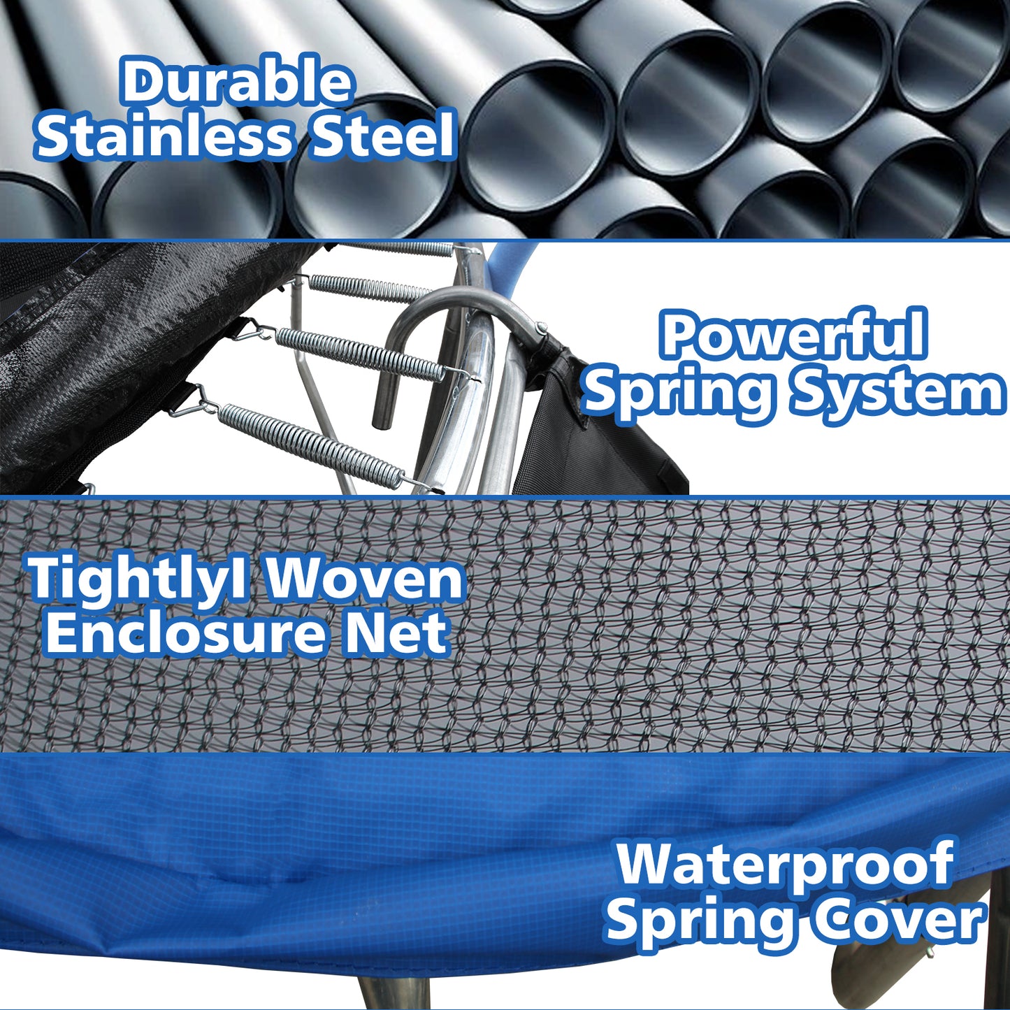 - 【CURVED POLES DESIGN】 For safety we innovated our trampolines with next gen curved poles. With the curved pole, there is more space between the child and the pole to have fun bouncing. The waterproof spring cover tightly includes high elasticity springs for added trampoline cushioning space to ensure safety!