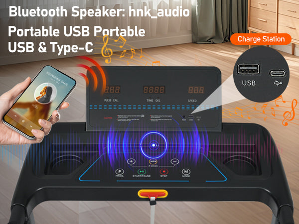 - 【Bluetooth Speaker】 Our treadmill is equipped with a Bluetooth speaker. The name of the Bluetooth is hnk_audio. When you are running on the treadmill, you can use your mobile phone to connect the treadmill's Bluetooth speaker to play music. This is the charm of technology. At the same time, the MP3 cable can also be connected to the speaker and play music.
