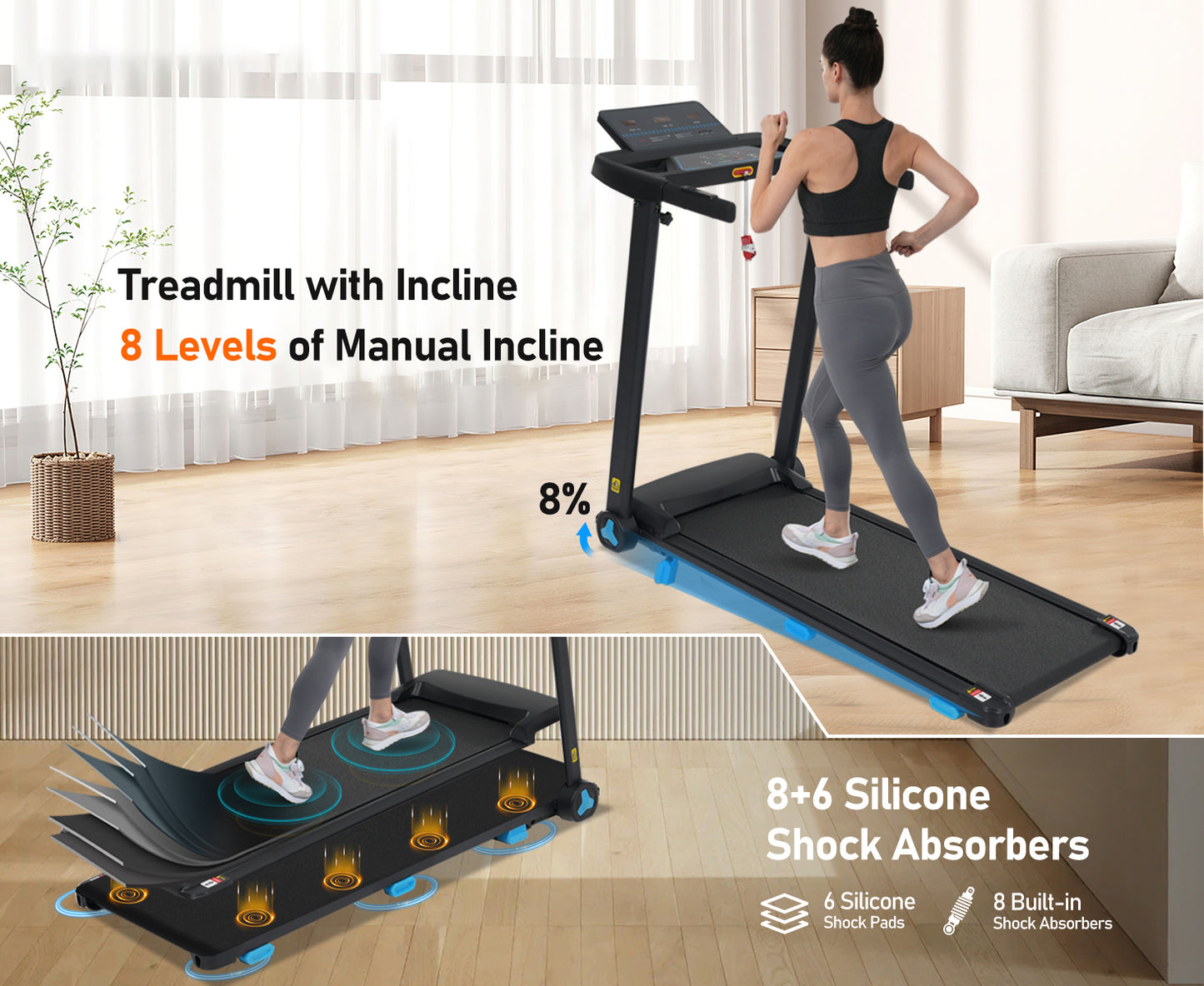 - 【8% Incline Treadmill-3.0HP Motor】This treadmill for home achieves intense workouts with a powerful 3.0HP motor and 8% incline adjustment, seamlessly switching between walking (0.5-4MPH), jogging (4-6MPH), and running (up to 10MPH) modes to target fat burning, cardio, or high-intensity workouts to meet your diverse fitness needs.