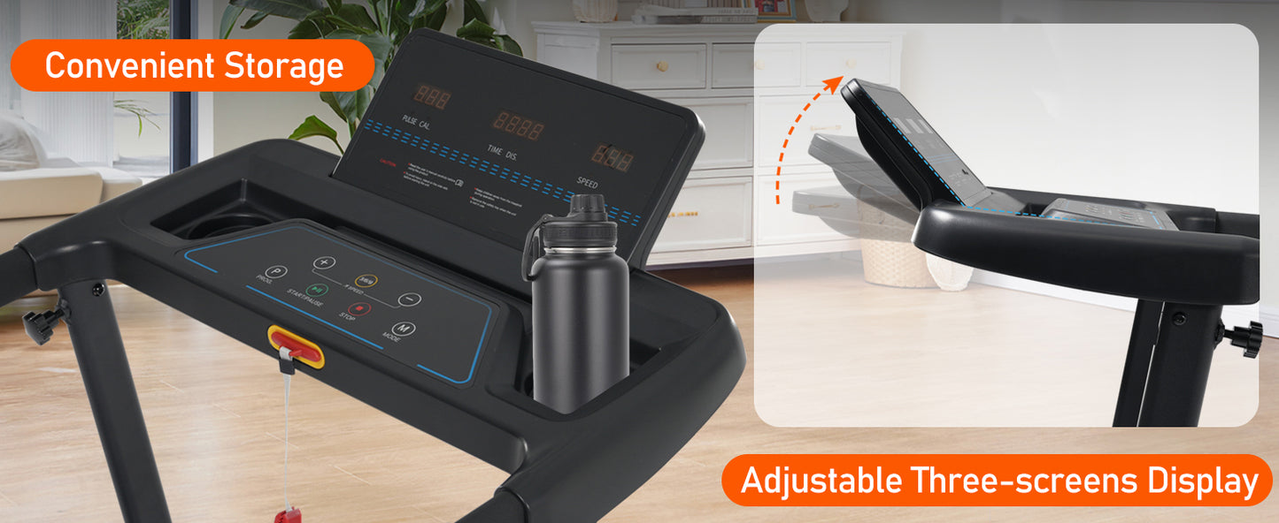 - 【Multi-function Console】The smart treadmill is equipped with a multifunctional console for controlling start/stop, speed, and built-in Bluetooth audio volume. It offers 12 preset scientific running programs to suit various needs. Three LED screens display real-time workout data, including time, distance, calories, speed, and heart rate. There's ample storage space for items such as water bottles, cell phones, and tablets, ensuring a comprehensive workout experience.