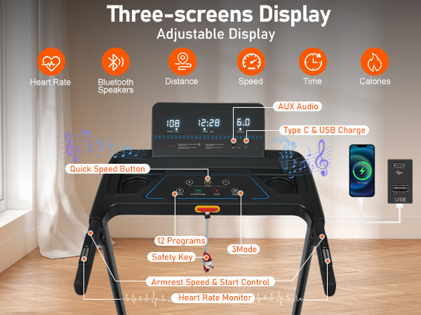 - 【Adjustable angle Three-screens Display】The adjustable angle three-screen display design can display sports data simultaneously to meet the needs of different users. The adjustable angle ensures that everyone can view information comfortably, enhances the sports experience, and is suitable for family members to share.