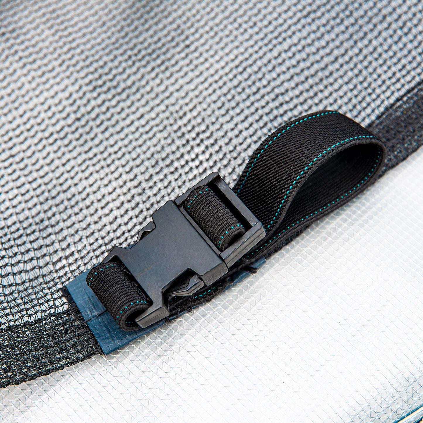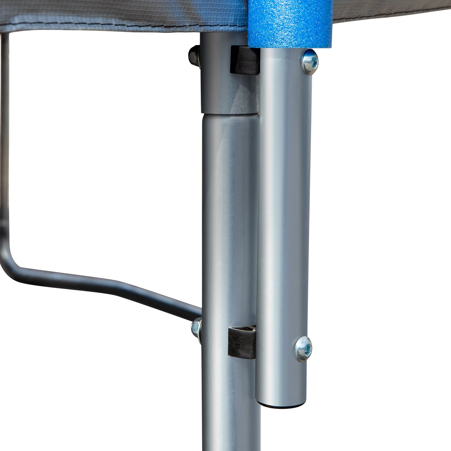 Safeseal System - This 16FT trampoline with enclosures feature a 360-degree safety net that is securely attached to the jumping mat all the way around, reducing the risk of an arm or leg falling through. A full enclosure with a zipper door surely lends you peace in mind. The rust-resistant steel 4-step ladder helps you get onto your trampoline quickly and safely. There's a backboard, You can play basketball in it. Premium Bouncing Experience - High-strength trampoline mat woven together that able to handle constant flexing, making it durable and soft on your feet. 108 galvanized springs evenly stretched around the mat ensure a smooth and responsive bounce. Built with Durability - Heavy gauge galvanized steel frame forms 6 W-shaped legs provide stable base for the jumping zone. The joins are press-fitted onto each frame piece to reduce frame noise and movement between sections and ultimately, reduces overall wear and tear. Fun Features - Jumping is more fun by adding a basketball goal, which will keep your kids busy all day. Assembly Details - We have designed this trampoline to be as easy as possible to assemble, we recommend two or more people for assembly. Quick tip: view the assembly sequence to reduce the construction time. Weight Capacity: 330 lbs. ***Trampoline jumping pad (pp material) that is wear-resistant. The trampoline will not fade when it is used outdoors (in order to keep the trampoline's new appearance when it is not in use, it is best to put on a protective cover) Add a triangle net around the backboard to keep the ball from flying off the trampoline Double color cover,the front blue and the back is green.you can interchanged at will