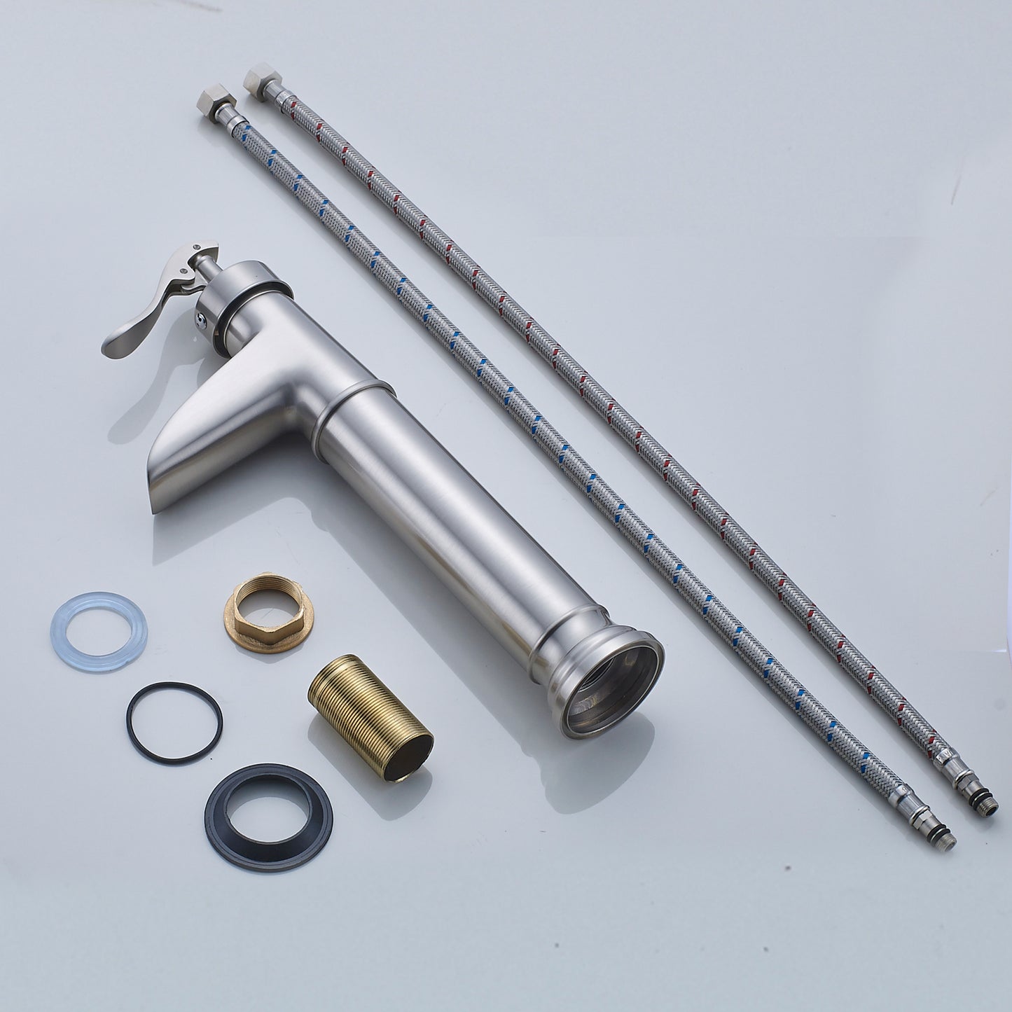 Finish: Brushed nickel finish provides a lightly brushed warm grey metallic look. From its durable, long-lasting construction to the contemporary and decor-complementing design, this faucet belongs in your bathroom.Easy To Install: Use the long screw which makes the installation easier and faster,the package including instruction,no plumber need you can do it by yourself.Waterfall Spout: Vessel sink bathroom faucet provides a clear and steady laminar stream, that provides a beautiful water presentation.