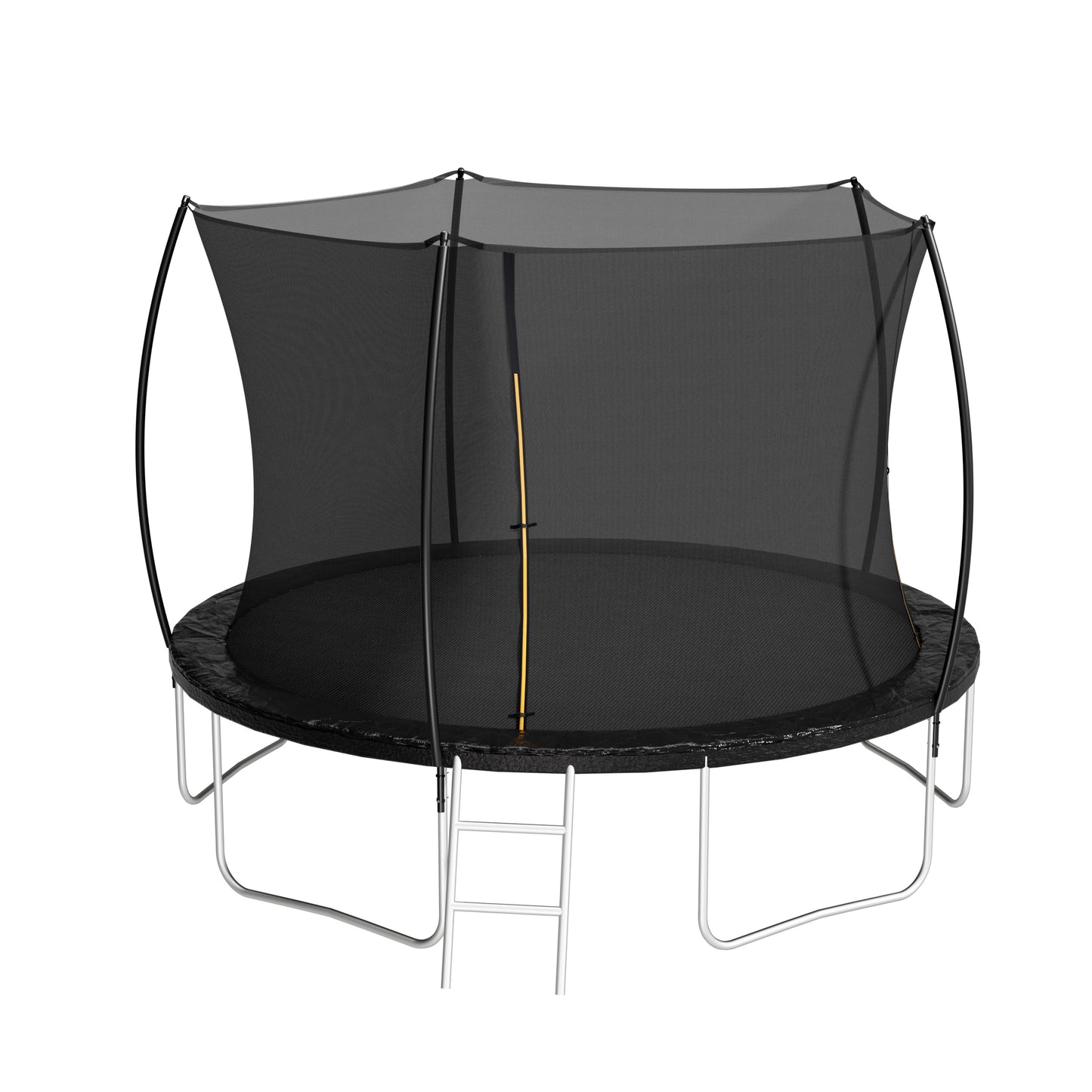 Safeseal System - This 12FT trampoline with enclosures feature a 360-degree safety net that is securely attached to the jumping mat all the way around, reducing the risk of an arm or leg falling through. A full enclosure with a zipper door surely lends you peace in mind. The rust-resistant steel 2-step ladder helps you get onto your trampoline quickly and safely. more than a function for children to play, fence is a double-door design, up and down more convenient More than that, we have Innovated our trampolines with innovative curved poles designed to protect your children from accidents or injury. Premium Bouncing Experience - High-strength trampoline mat woven together that able to handle constant flexing, making it durable and soft on your feet. 70 galvanized springs evenly stretched around the mat ensure a smooth and responsive bounce. Built with Durability - Heavy gauge galvanized steel frame forms 5 W-shaped legs provide stable base for the jumping zone. The joins are press-fitted onto each frame piece to reduce frame noise and movement between sections and ultimately, reduces overall wear and tear. Assembly Details - We have designed this trampoline to be as easy as possible to assemble, we recommend two or more people for assembly. Quick tip: view the assembly sequence to reduce the construction time. This trampoline has Double-sided color pad.(Black and blue)