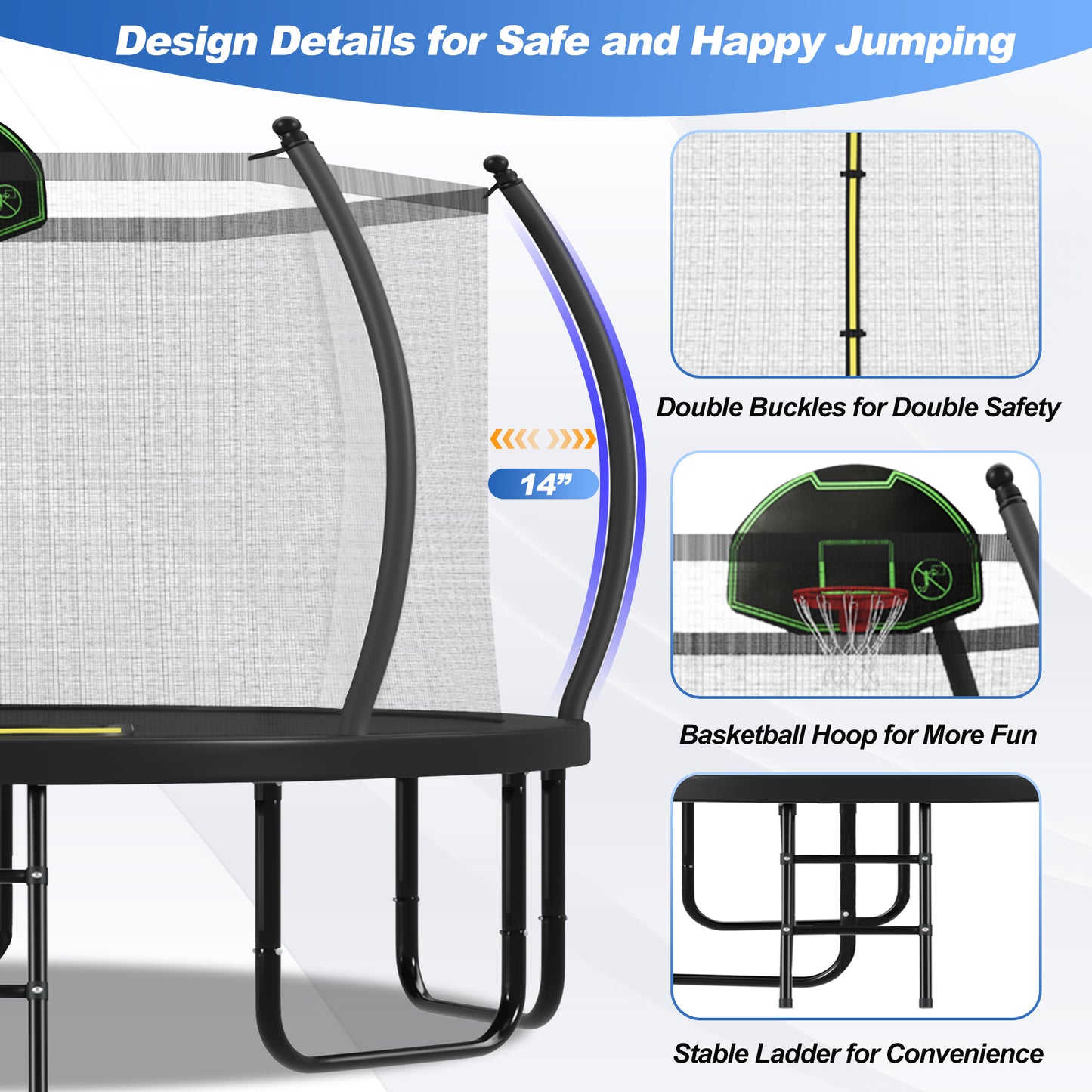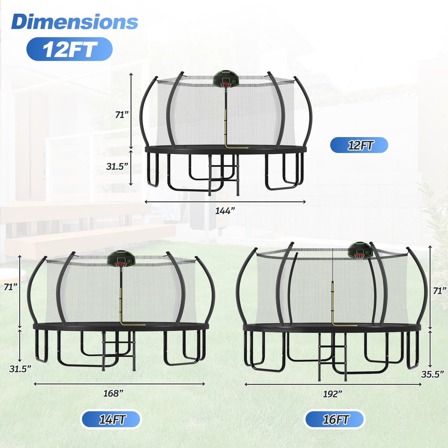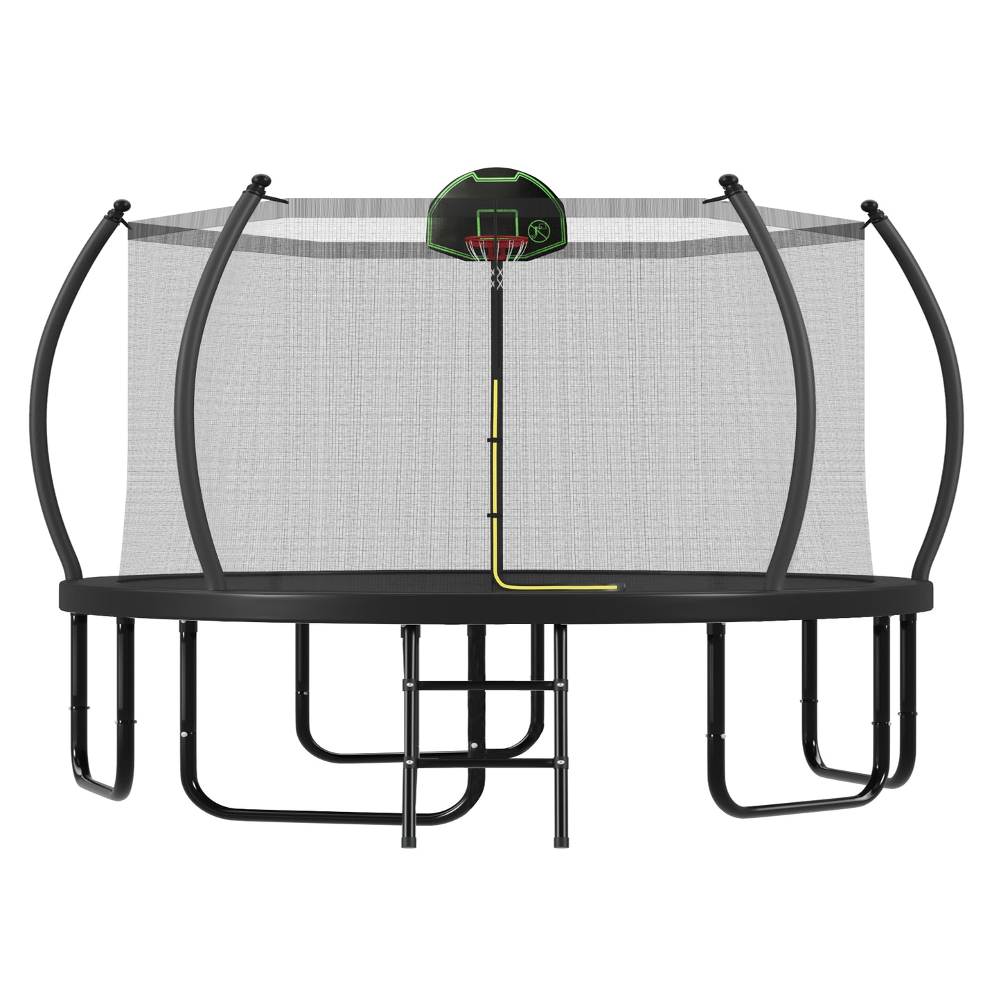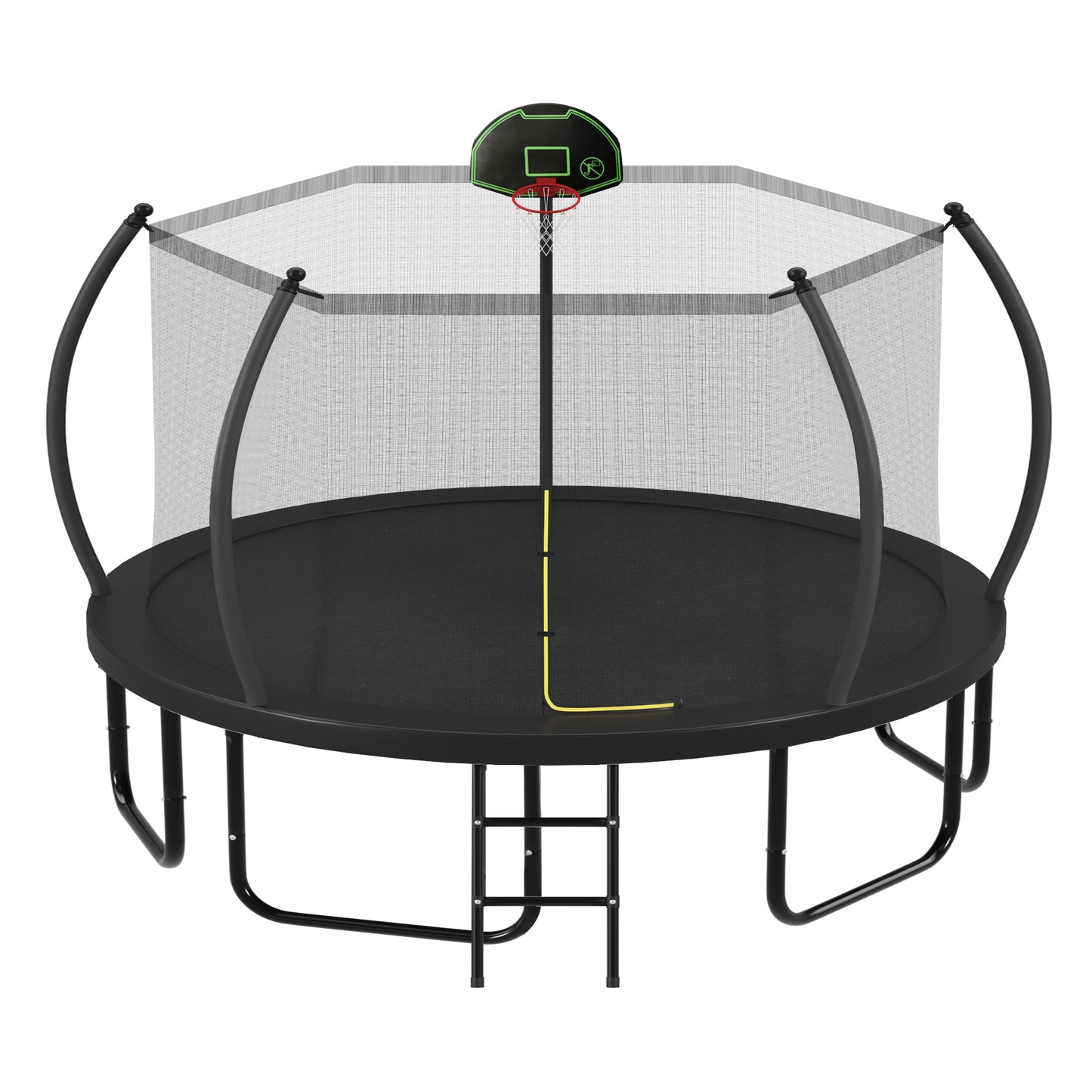 12FT Trampoline with Basketball Hoop for Kids and Adults, Round Outdoor Trampoline with Enclosure Net & Curved Poles & Ladder