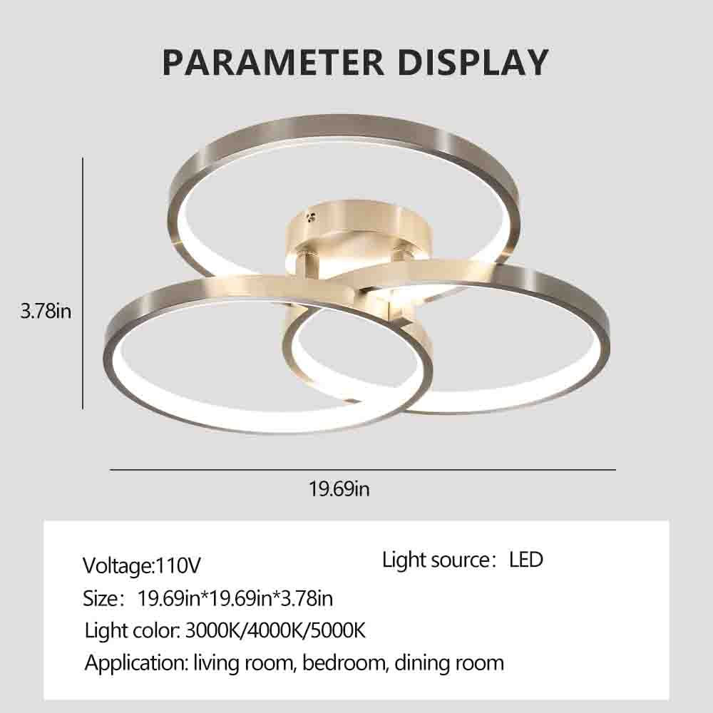 20' Modern LED Ceiling Light Fixture - Circular 3-Ring Design, Dimmable, Contemporary Brushed Nickel Finish for Living Room, Bedroom & Office