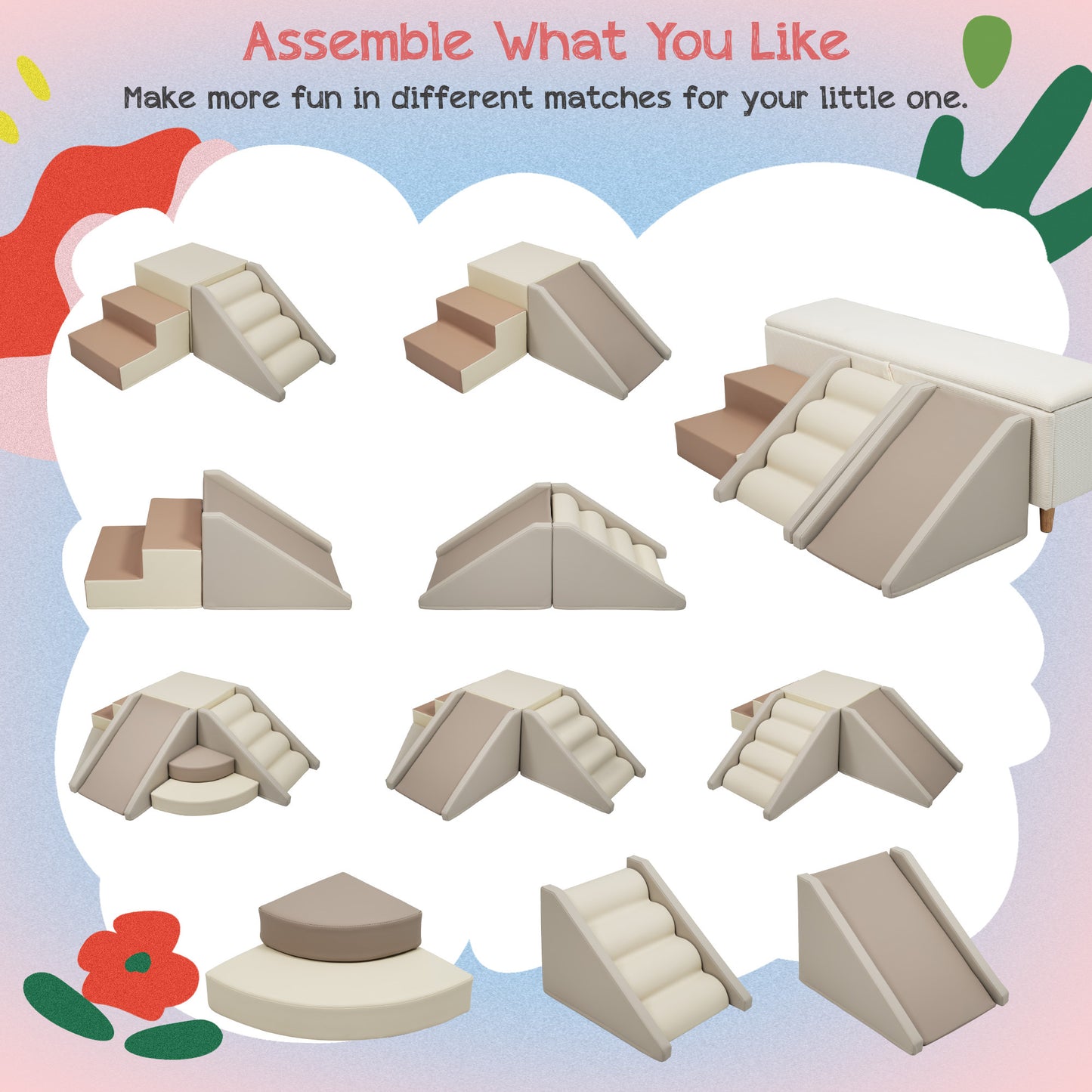 - [Skills Through Play] More than just fun, our soft play foam helps children grow! It enhances motor skills as they climb and balance, while the different textures encourage sensory exploration. Open-ended play sparks imagination, whether they’re pretending the foam is a mountain, a bridge, or a secret hideout. By moving and assembling the pieces, kids also improve coordination, strength, and problem-solving skills—all while having a blast.