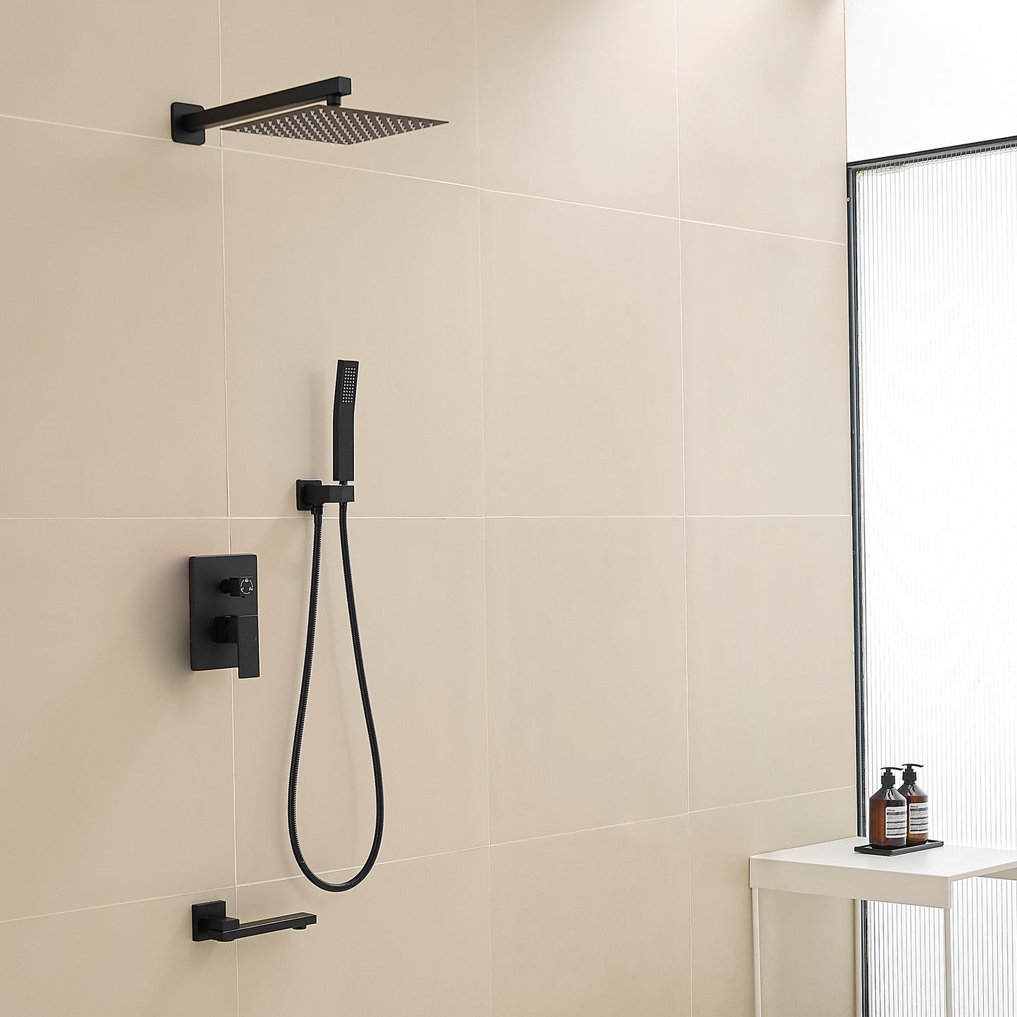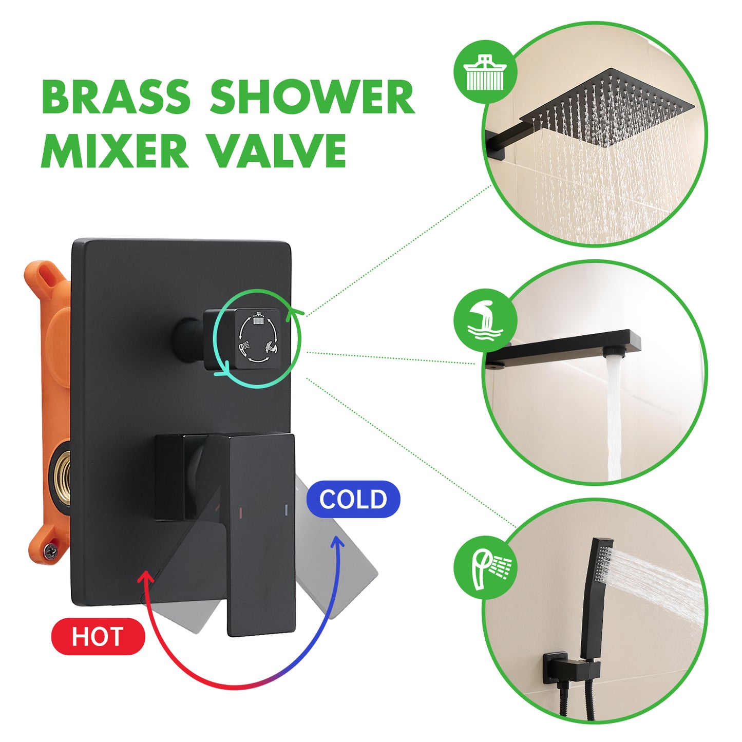 Included - This Shower kit include 10” square fixed shower head (304 stainless steel), Multifunction (2 In 1) hand-held shower head with Sprayer (brass), 15” shower arm wand (304 stainless steel), 59” shower hose (stainless steel),and 9''Down Sprayer shower holder (brass) and Shower Faucet Rough-in Valve Body (brass), all you need for having the ultimate shower experience!