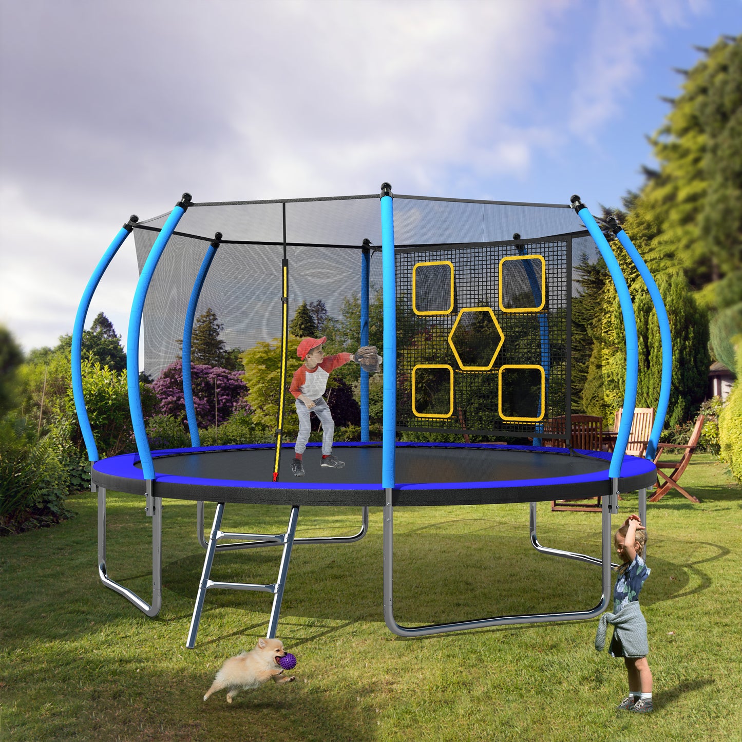 - Safeseal System - This 14FT trampoline with enclosures feature a 360-degree safety net that is securely attached to the jumping mat all the way around, reducing the risk of an arm or leg falling through. A full enclosure with a zipper door surely lends you peace in mind.