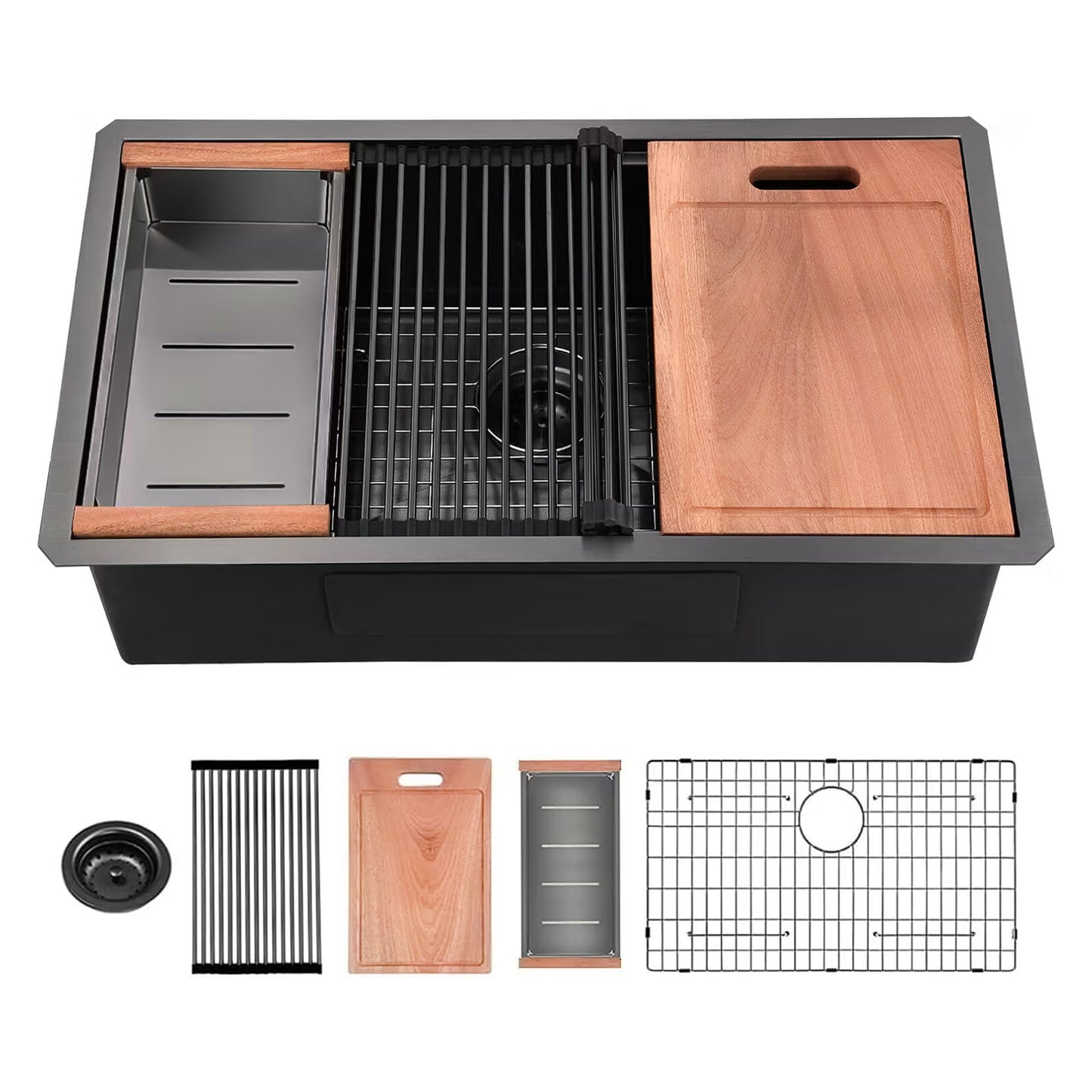 - Package Includes:28 gunmetal black stainless steel undermount workstation sink, colander, roll-up rack, bottom rinse grid, cutting board, basket strainer drain assembly, mounting clips, cut out template and installation instruction, the complete accessories meet your daily needs and bring great convenience to your life