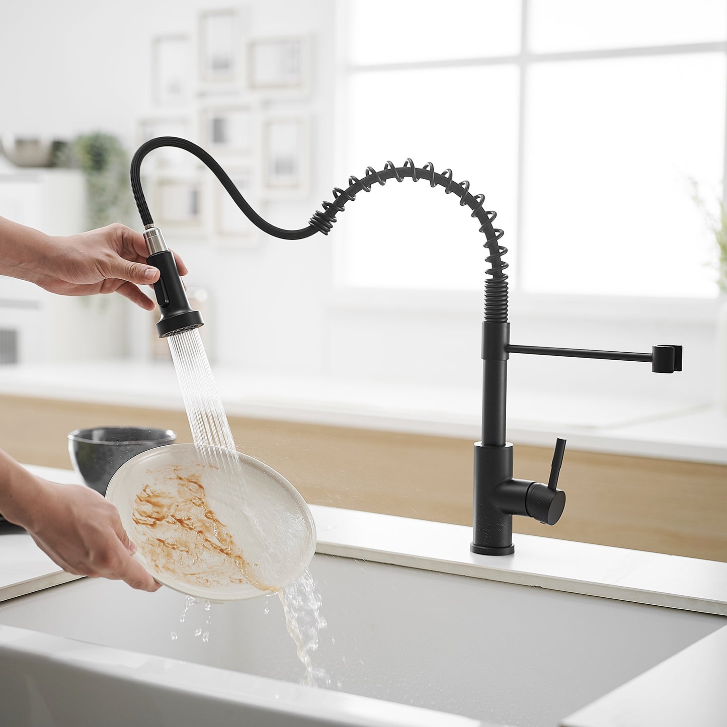 【DUAL MODE SETTING 】Your kitchen faucets with pull down sprayer provides soft aerated stream and splash-free powerful spray due to its hard rubber sprayer holes. 360 degree kitchen sink faucets sprayer, the switch can be placed in every position as you like.