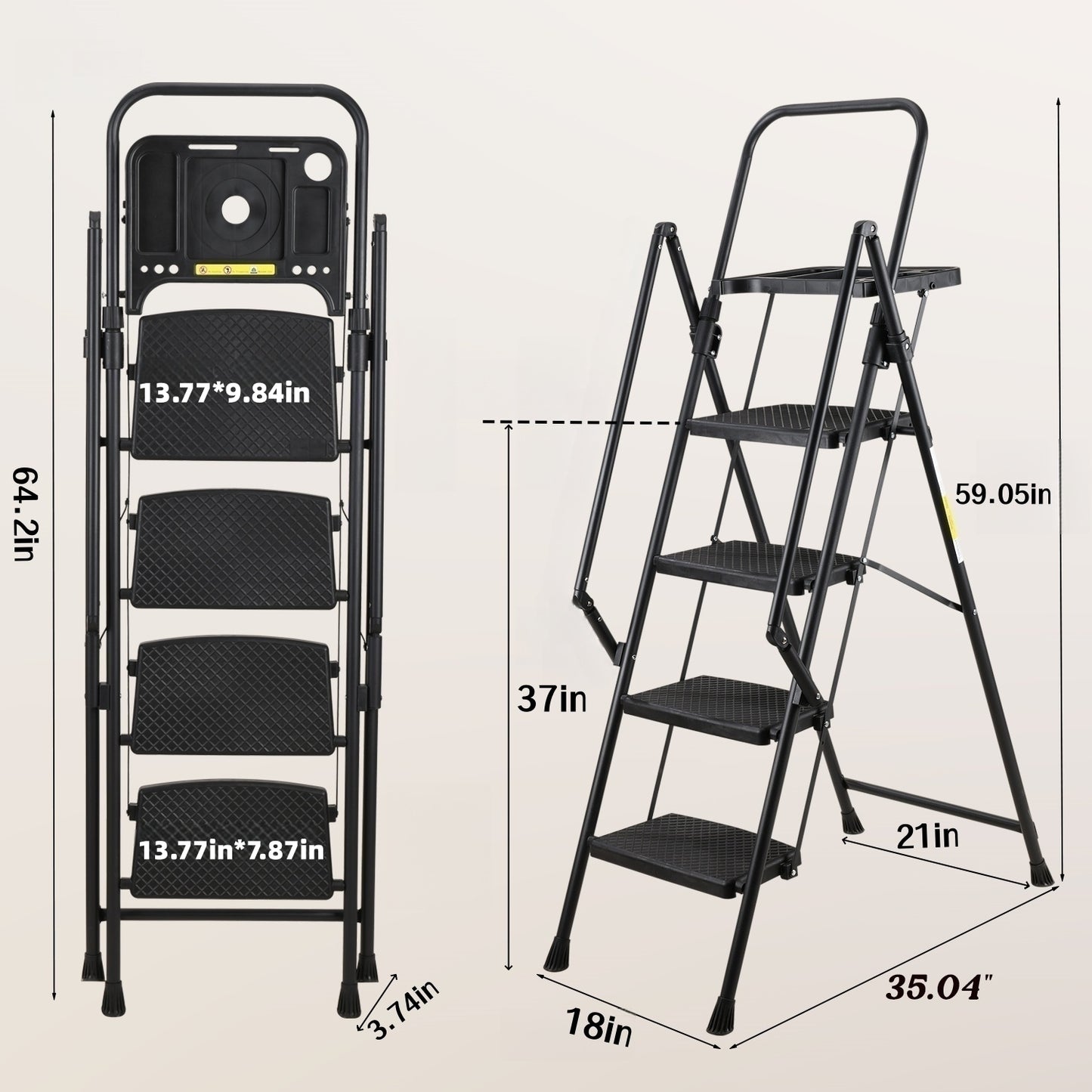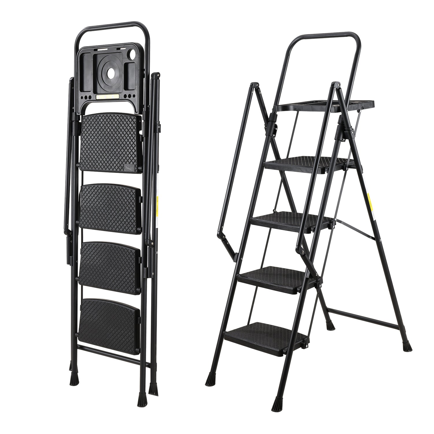 - Flexible design: With a detachable tool tray at the top, you no longer need to climb up and down to retrieve your tools while working. You can place them in the tool tray. When you don't need them, they can be removed.PORTABLE AND SPACE-SAVING: This Folding Step Stools comes fully assembled. Lock and open system for easily open and fold. Easy to transport and carry, suitable for indoor and outdoor use.