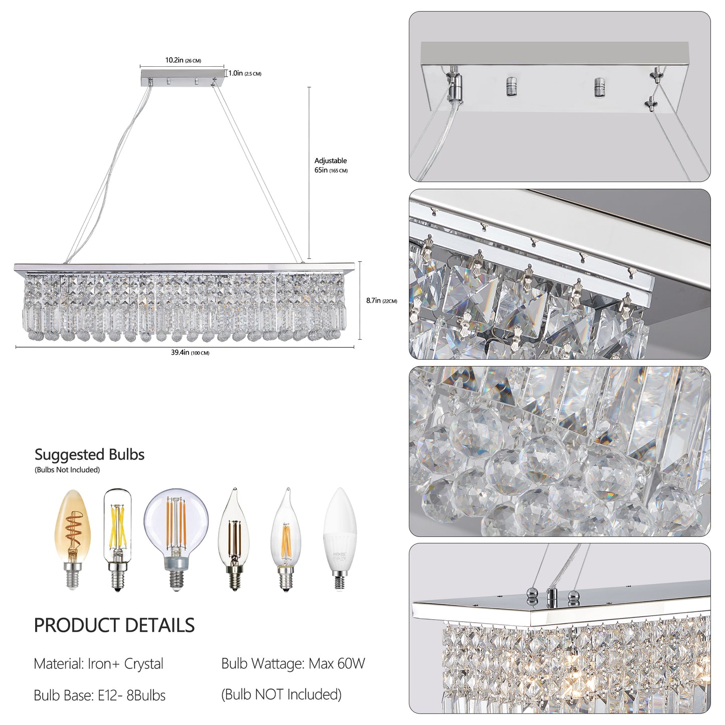 This modern chandelier is built with a high-quality iron metal frame and selected crystals, which is not only durable but also luxurious in appearance, which is the perfect way to enhance your home decoration taste.Rectangular rectangular design, suitable for a variety of interior scenes, including kitchen island, dining table and living room, showing a simple and modern style.This chandelier does not contain bulbs, but is compatible with a variety of lamp types, such as LED bulbs, incandescent bulbs and energy-saving bulbs, giving you the freedom to choose the most suitable light source.With detailed installation instructions and all necessary installation hardware, you can easily complete the installation without professional skills, saving time and money.Although this product does not contain light bulbs, it is recommended to match energy-efficient LED lamps to reduce electricity bills and reduce carbon emissions, providing bright and comfortable lighting effects.