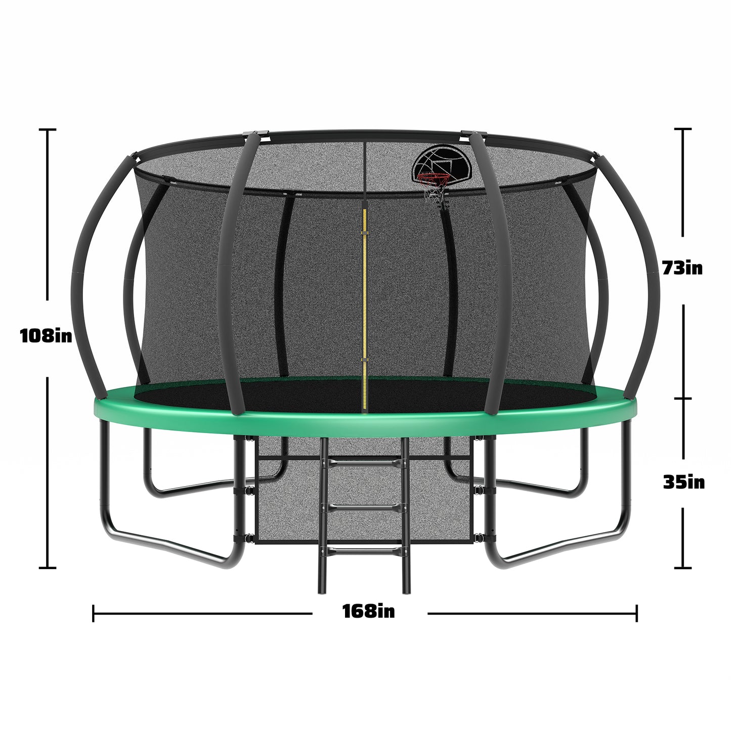 - Safety First-14 FT Trampoline is equipt with 8 high safety enclosure poles and heavy gauge galvanized rust resistance steel construction. 4 W-shaped legs secure stability.