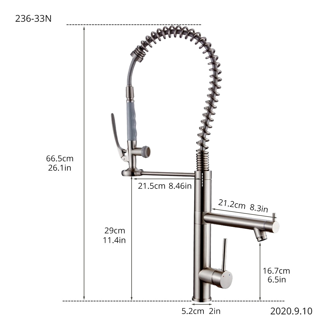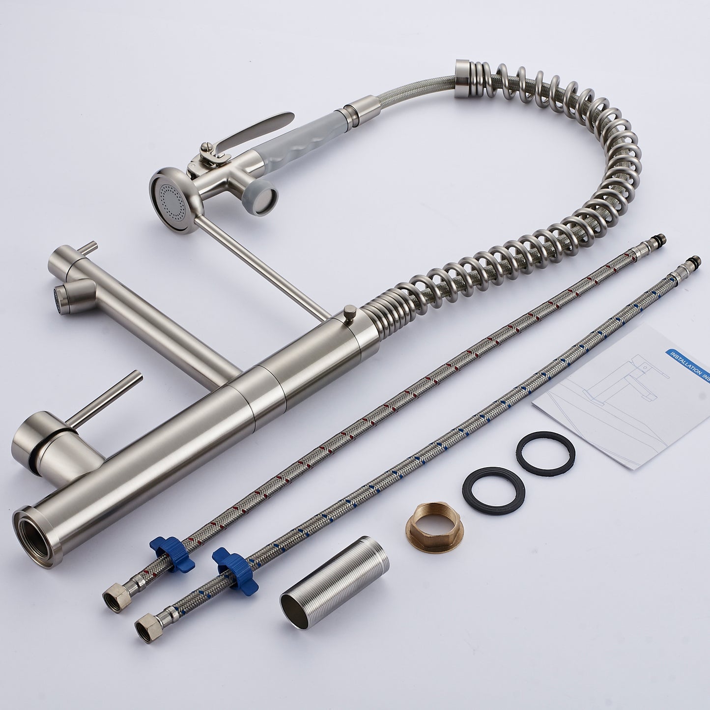 [RELIABLE QUALITY]: The kitchen faucet is made of solid brass construction inside, durable and lead-free for greater safety. Provide you with clean kitchen water at all times. Brushed nickel coating on the surface, simple and beautiful, not easy to rust or dirty. [TWO ROTATABLE SPOUTS]: The kitchen faucet with pull down sprayer provides splash-free powerful spray to rinse dirt from dishes. The injected spout also allows 360° of rotation to provide a soft aerated stream of water for easy filling of pots and pans. These two spouts could open at the same time and you can save more time.Single Handle:The water flow and temperature can be easily adjusted to the right level with the single handle. The faucet body can 360° rotated, so you can install the handle in any position. These will give you a more enjoyable use experience. Perhaps you have never found that your kitchen can be so wonderful.