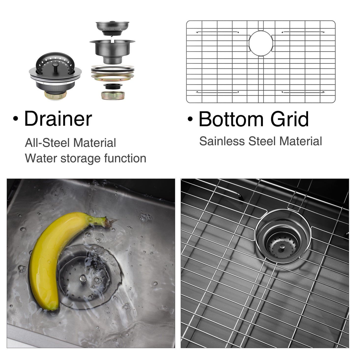 - Purchase includes kitchen sink, chrome bottom grid, strainer drain, faucet and topmount clips