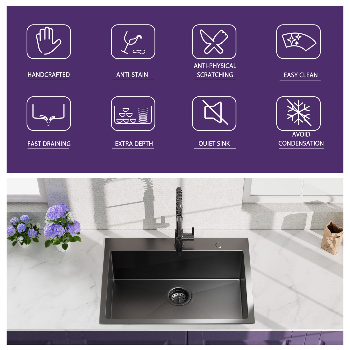 - Large Capacity: Our gunmetal black top mount kitchen sink is designed to hold large items like stockpots and baking sheets, which brings you great convenience in daily use.