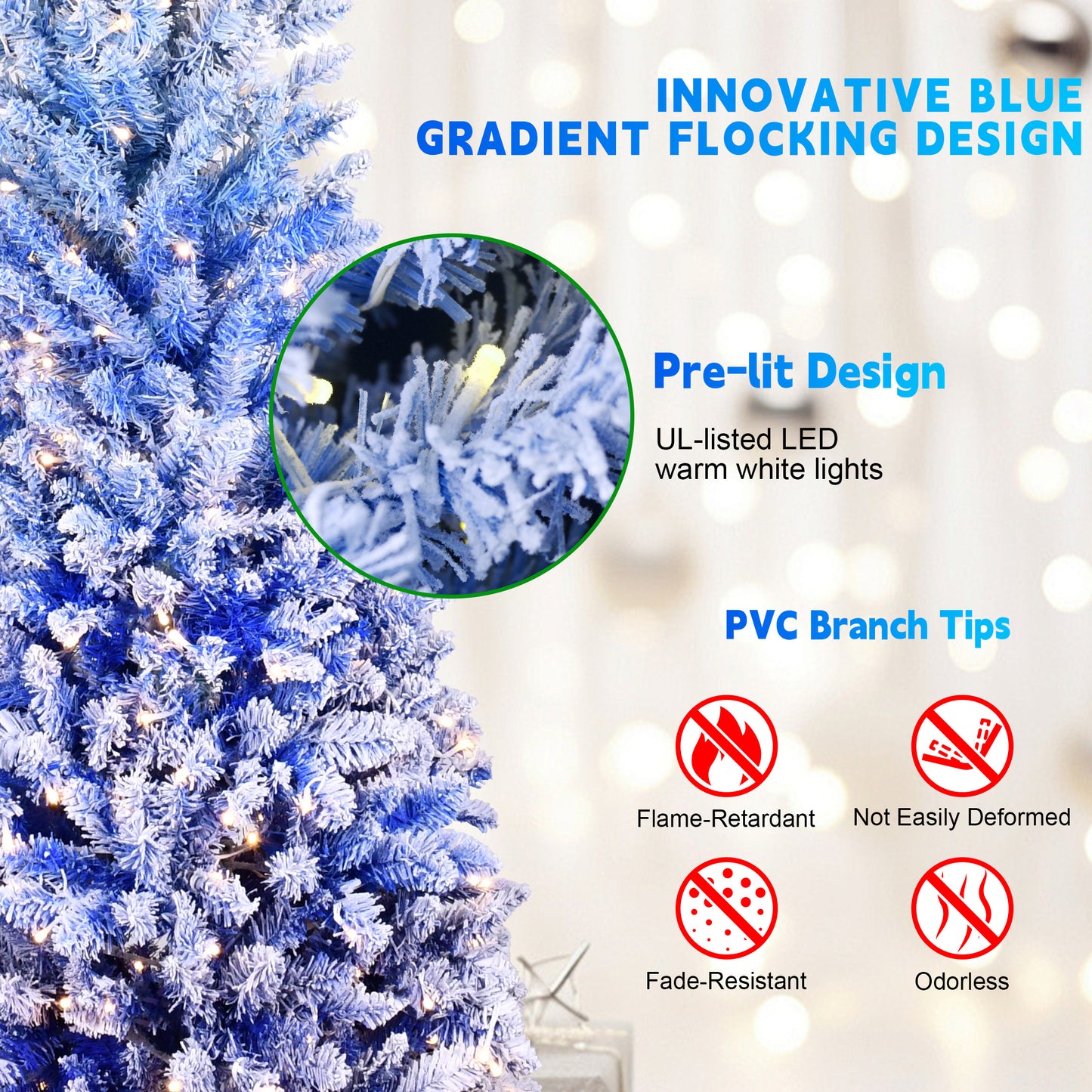 6FT Blue Gradient Flocked Pencil Christmas Tree with 200 Warm White LED Lights, 485 Tips, Hinged Branches, Slim Design, Metal Stand – Narrow Prelit Tree for Holiday Home Decor