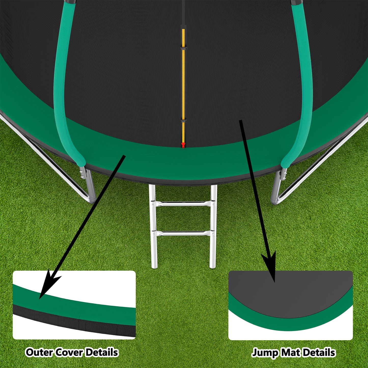 - Safeseal System - This 14FT trampoline with enclosures feature a 360-degree safety net that is securely attached to the jumping mat all the way around, reducing the risk of an arm or leg falling through. A full enclosure with a zipper door surely lends you peace in mind.