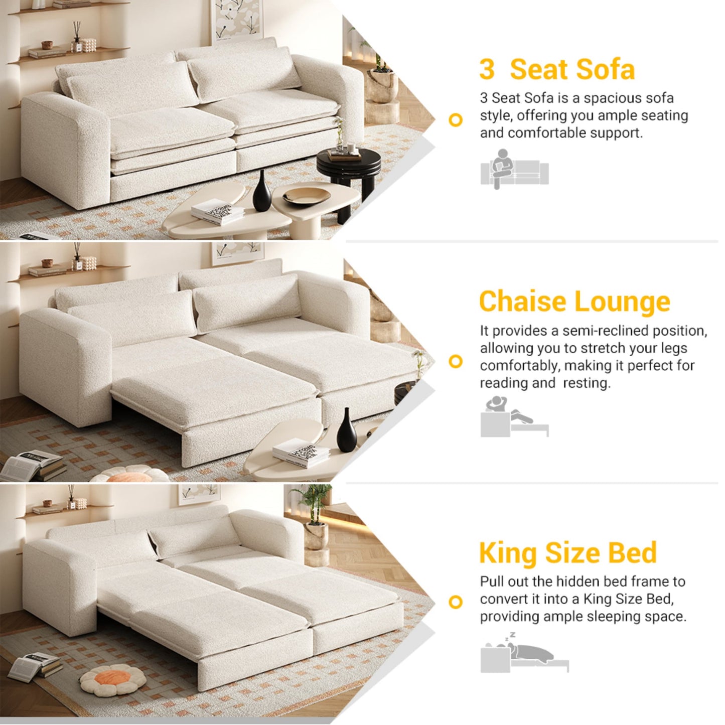 - 【3-in-1 Convertible Sleeper Sofa Bed】This sofa features three different adjustment modes to meet your needs. The sofa bed can effortlessly transform from a three-seat sofa into a recliner and a King Size Bed. Its versatile design reduces the need for additional furniture, making it particularly suitable for small spaces or areas where maximizing utility is essential. With its flexible design and practicality, it is an ideal choice for modern homes, fulfilling daily needs while adapting to tempor