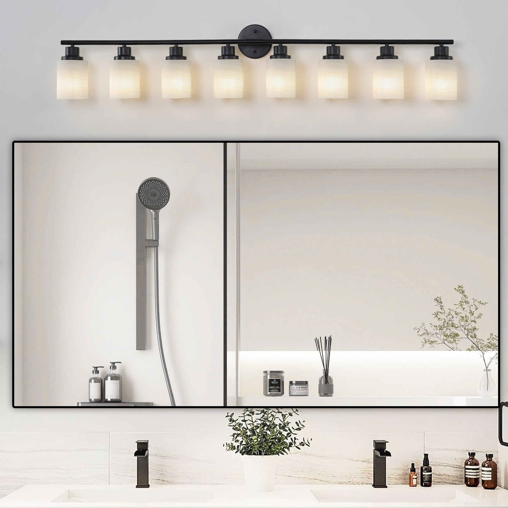 52' Modern 8-Light Vanity Bathroom Mirror Light, Frosted White Glass with Black Iron Frame